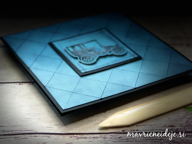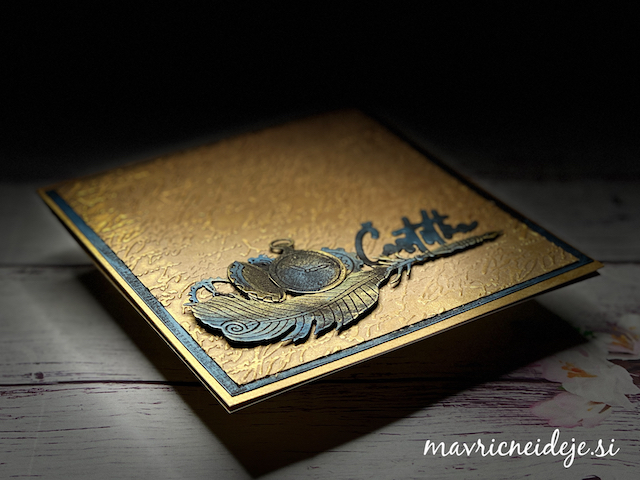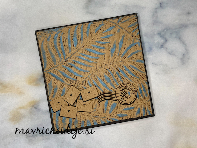 Na izbočene liste sem nanesla Nuvo embelishment mousse v modri barvi, da so listi dobili kovinsko moder sijaj. Dodala sem še drobne kuverte, in napis, ki sem jih podložila s ćrnimi izrezi.