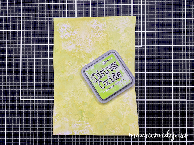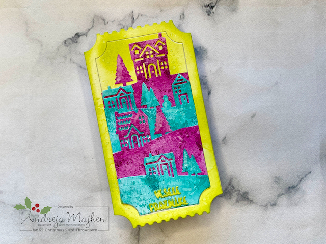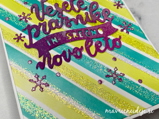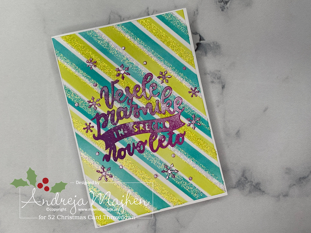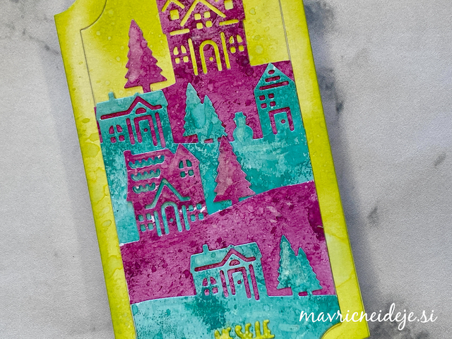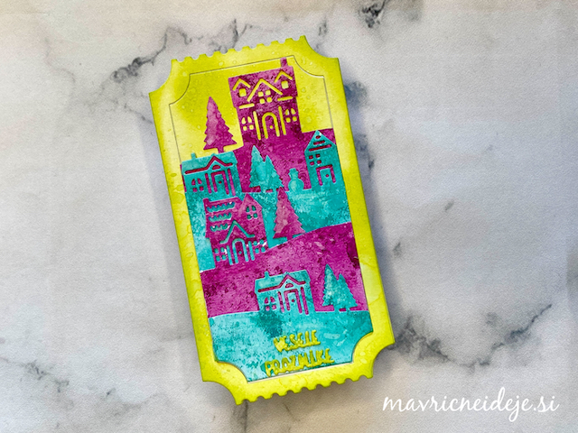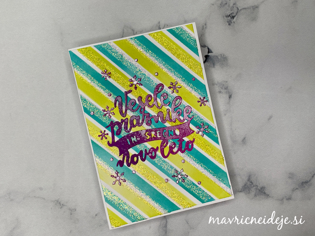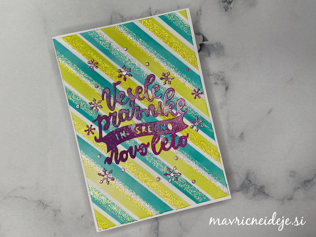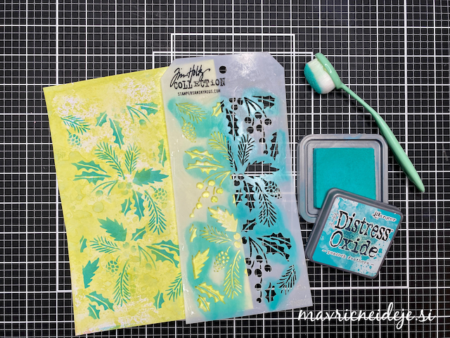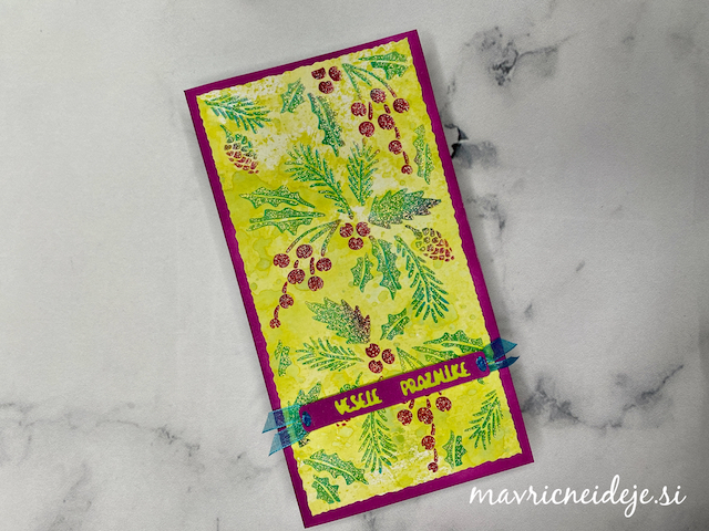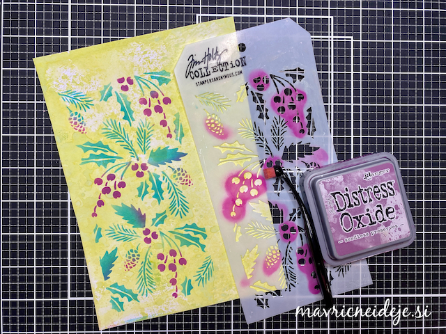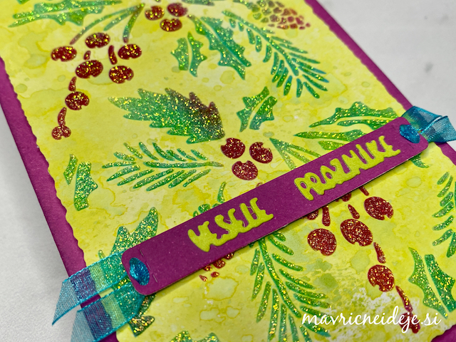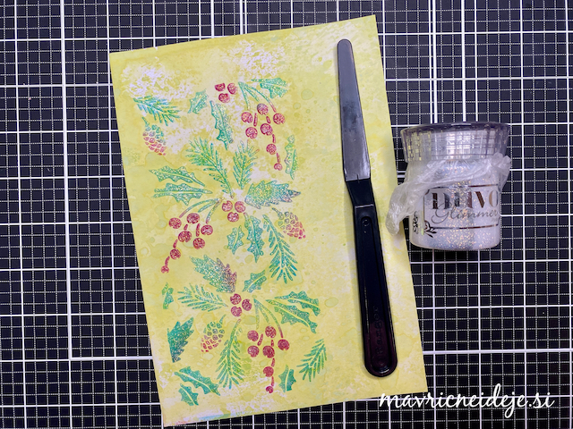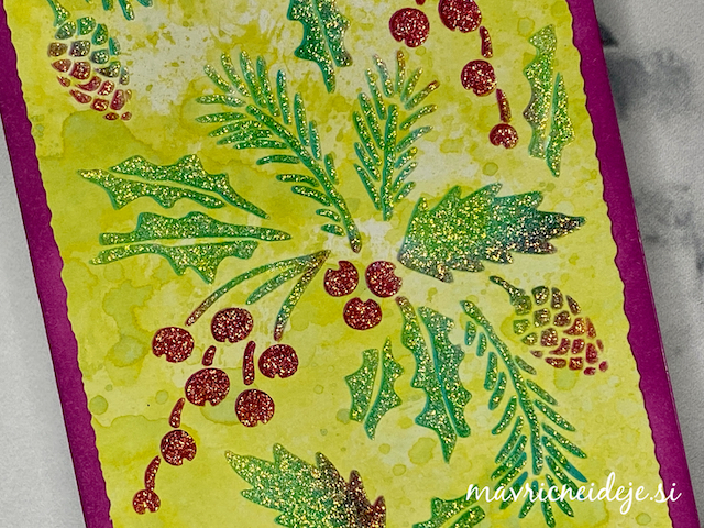 Akvarelni papir sem obarvala s svetlo zeleno barvo, nato pa preko stencil šablone z drobnim čopičem na liste bodike in jagodke nanašala turkizno in magenta barvo. Na koncu sem prav tako preko stencil šablone dodala Nuvo bleščečo pasto.