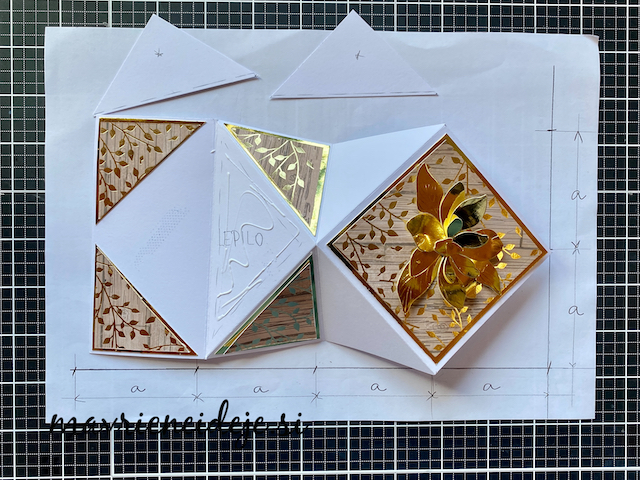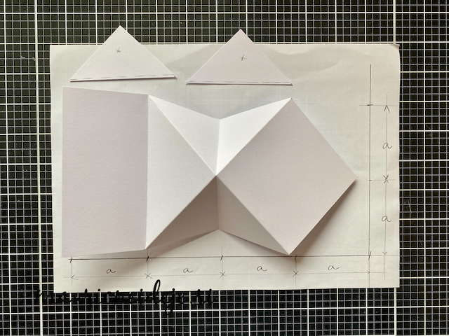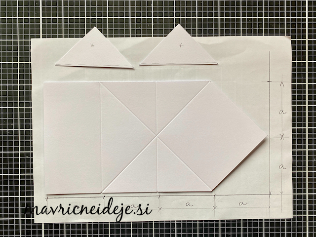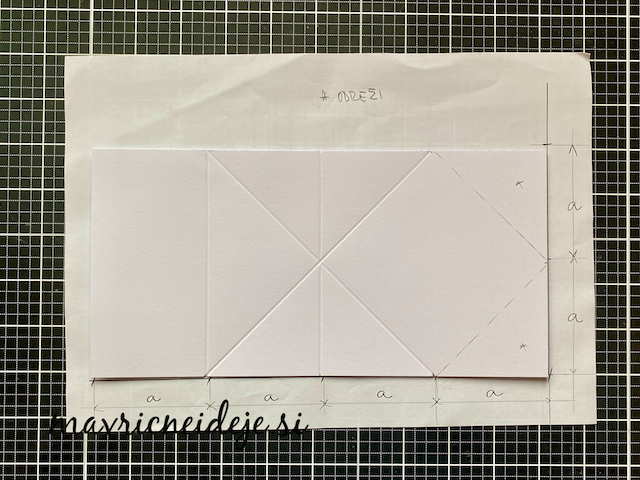 Osnovo sem si izdelala iz 250g UK Craft papirja kot je prikazano na fotki. Vse označbe “a” zamenjamo s številko in dobimo poljubno dimenzijo osnove. Prepogibe sem izdelala na plošči za utore.