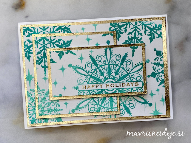 Nato sem v odprtine polagala izreze in odtisnila motive. Izreze sem menjala, dokler nisem naredila vseh odtisov. Uporabila sem Nuvo hibridno blazinico, ki je vododporna.