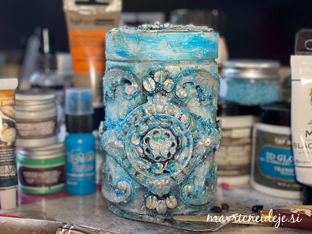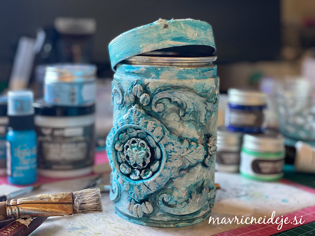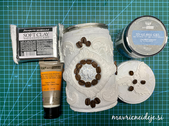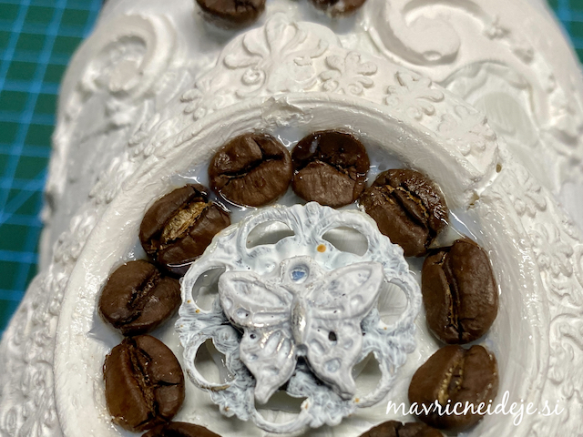 Dekorativne elemente sem izdelala iz modelirne mase, ki sem jo vtisnila v kalupe. Tako dobljene oblike sem še mokre vzela iz kalupov. Nekatere sem naložila na pločevinko in počakala, da so se posušili. Tako so dobili ustrezno obliko. Nato sem pločevinko premzala z belim geso premazom. Preko stencil šablone z vzorcem cvetja sem nanesla teksturno pasto in nato s 3D gloss medijem elemente prilepila na pločevinko. Dodala sem še kavna zrna.