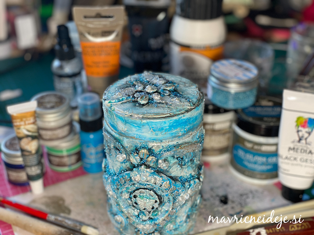 Izdelava tega mixed media projekta je potekala v treh fazah: priprava dekorativnih elementov, lepljenje in barvanje.