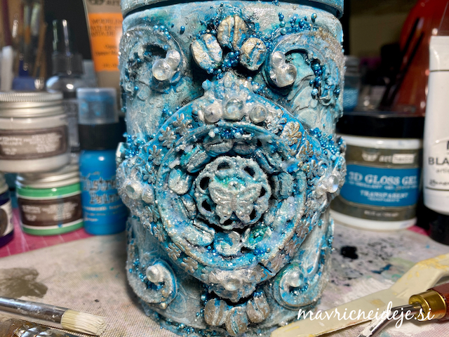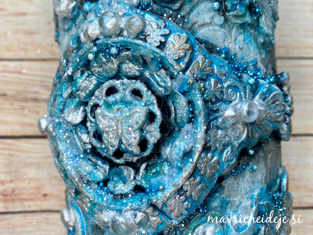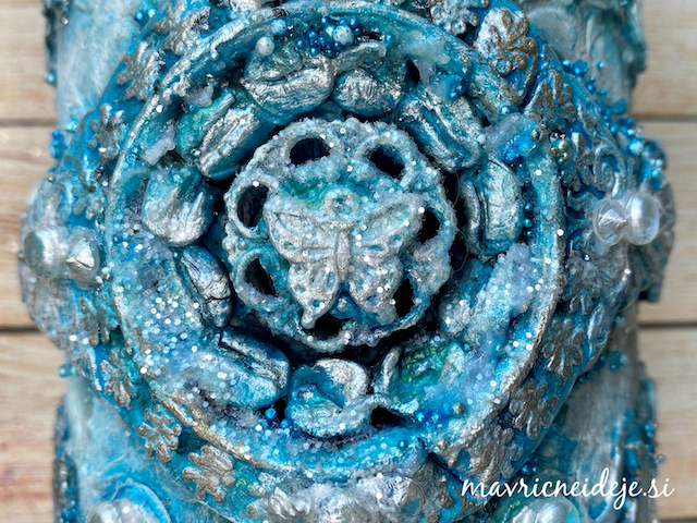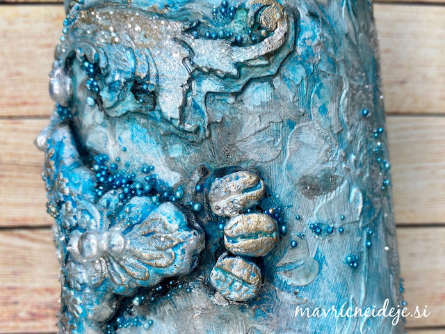 Modre mikroperle sem pomešala v 3d gloss gel in jih z lopatko in čopičem nanesla na izdelek.