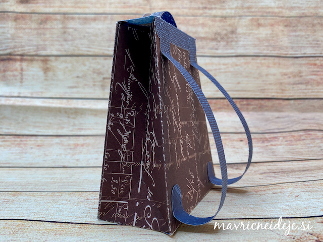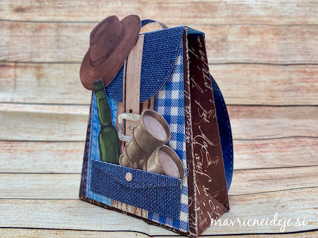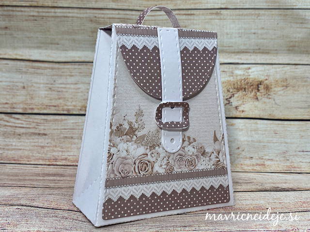 Najprej sem iz 250g UK Craft belega papirja izrezala osnovi za nahrbtnik in vrečko, nato pa iz LemonCraft Waiting For You 15×15 cm papirja še dekorativne elemente. Šablona za dekoracijo po velikosti ustreza papirju, tako da se lahko ujame vzorec.