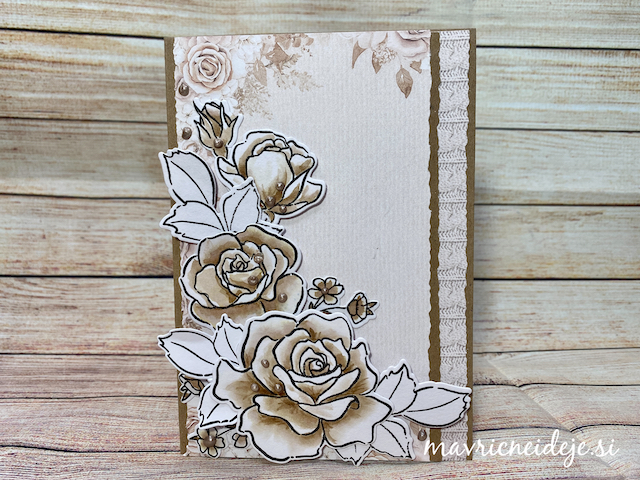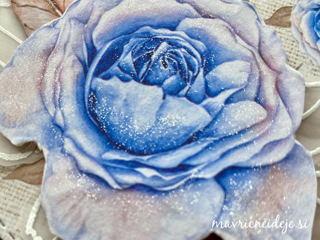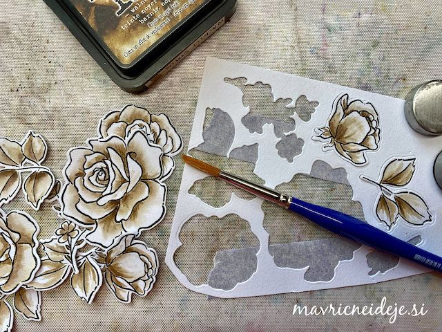 Seveda sem se lotila tudi vrtnic, ki sem jih v akvarelni tehniki pobarvala z rjavo Distress Ink blazinico. Robove sem odrezala s Tim Holtz Dekle trimmer giljotino, da so nastali valoviti zaključki.
