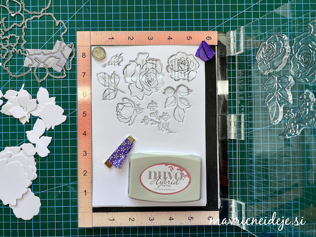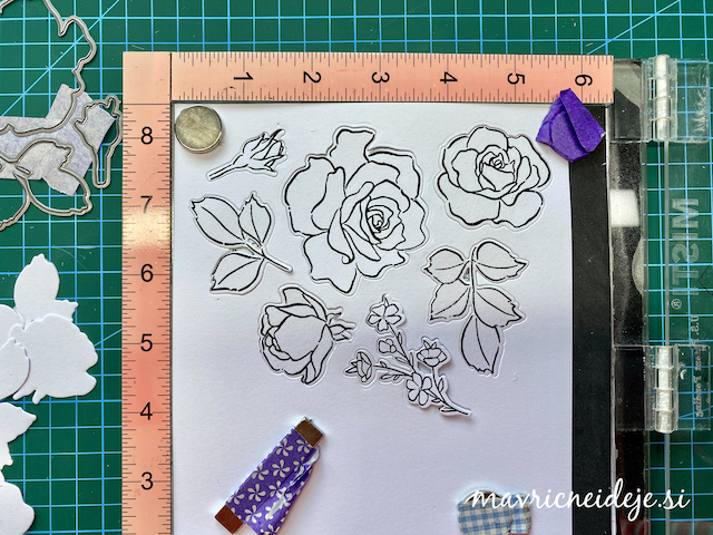 Rezalne šablone vrtnice sem pustila kar sestavljene, le šablono za listek in popek sem odstranila in ju z maskirnim trakom pridružila ostalim. Nato sem iz akvarelnega papirja naredila veliko število izrezov, vedno vse rezalne šablone hkrati. Negativ izrezov sem postavila v pripomoček za natančne odtise in v odprtine položila štampiljke. Prvi odtis sem naredila na “šmir” papir, da sem preverila točnost postavitve štampiljk.