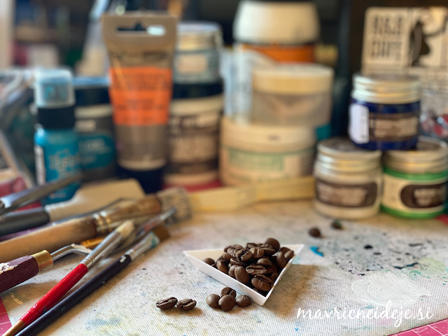 Tudi na kavina zrna sem nanesla tanko plast belega gesa, nato sem se lotila barvanja z akrilnimi barvami.
