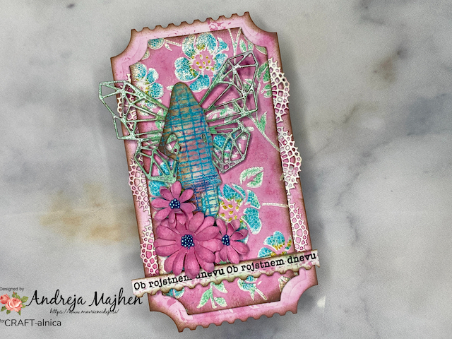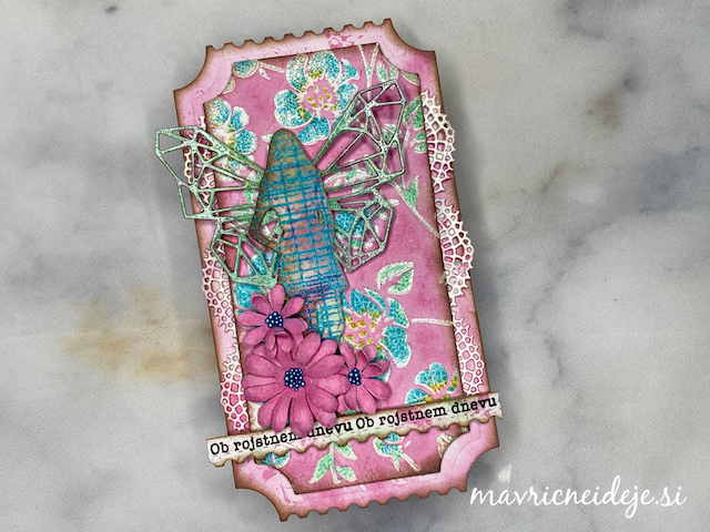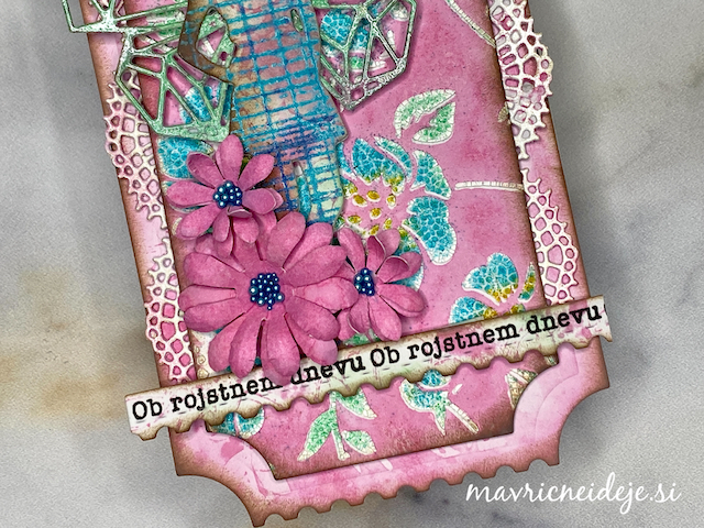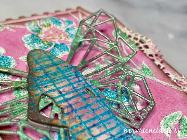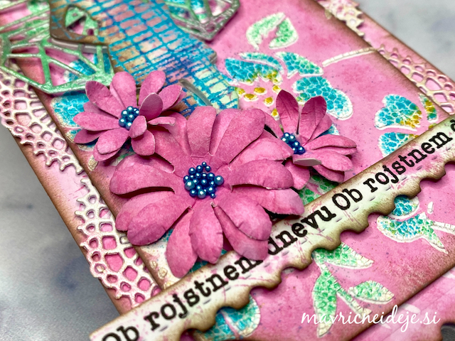 Dekorativne elemente sem izdelala iz dvokomponentne smole, jih premazala s prozornim gesom in nato pobarvala z rjavo akrilno barvo ter roza mica prahom.
