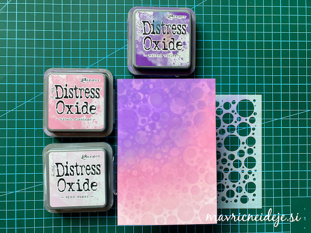 Z Distress Oxide inki sem preko stencil šablone na bel papir ustvarila “bokeh” vzorec.