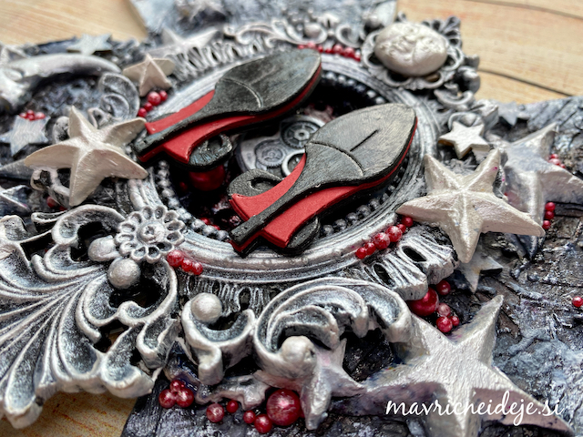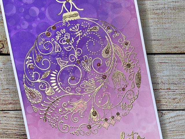 Na suho ozadje sem z zlatim prahom vroče embosirala odtis novoletnega okraska in napis. Dodala sem še zlate Nuvo tekoče perle in zlat marker z bleščicami.