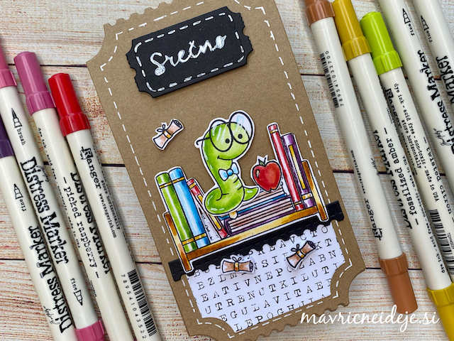 S pomočjo rezalne šablone Studio Light (nr.15 SL-ES-CD15) sem izrezala osnovo iz črnega papirja, nato pa na roke še bel papir, ki sem ga pobarvala z Distress Oxide inki.