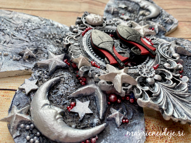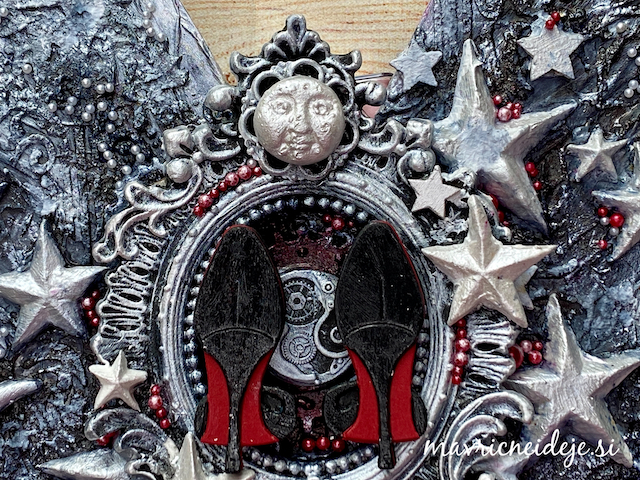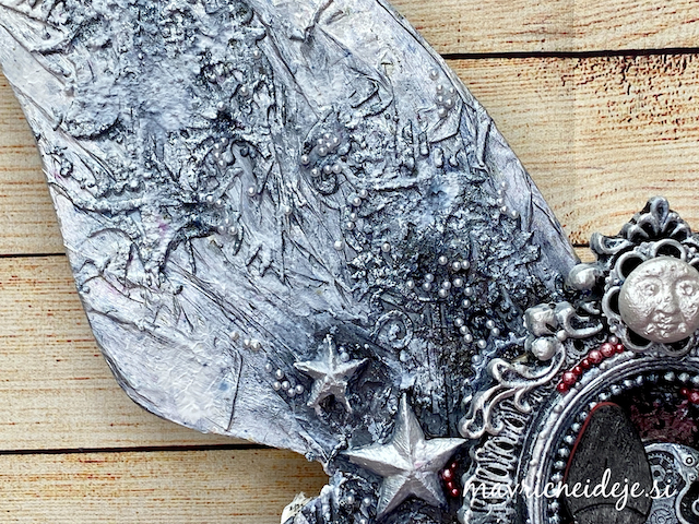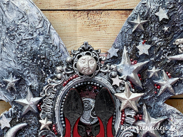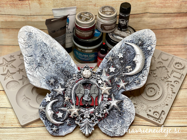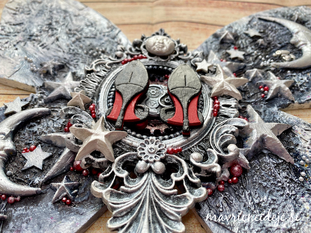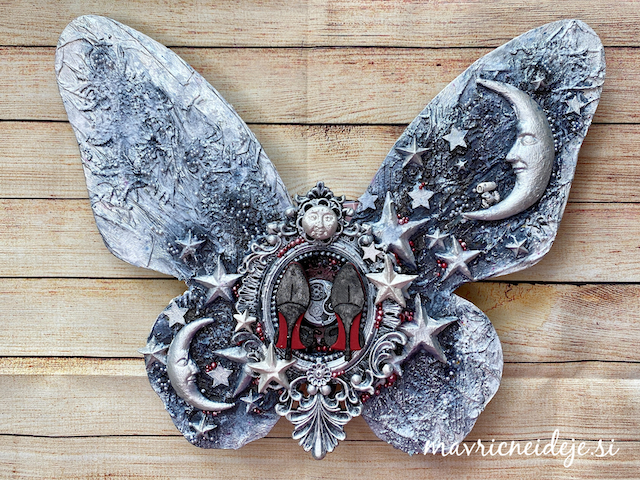 Ob zaključku gimnazije si je hči zaželela nekaj v obliki metulja v beli barvi, z malo črne in pikico rdeče. Izdelala sem velikega metulja v mixed media tehniki, pri čemer tako postavitev kot vsi elementi nosijo pomembna sporočila.