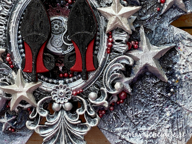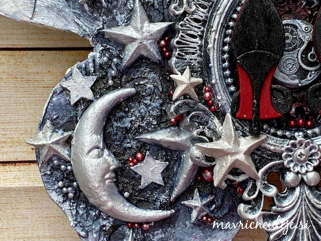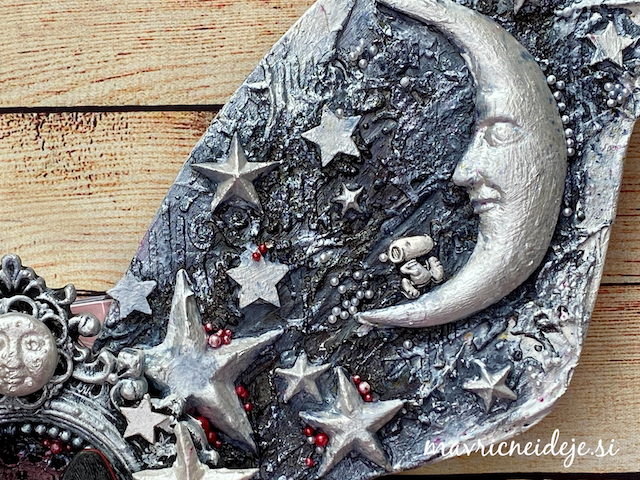 Izreze sem prav tako pobarvala z voščenkami. Za sijaj sem uporabila Nuvo Embelishnemt mousse, ki sem ji razredčila z vodo in nanesla na pesek, izreze in morje.