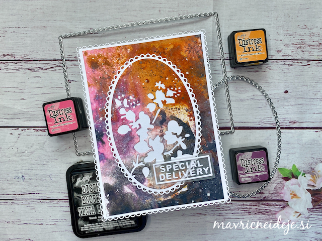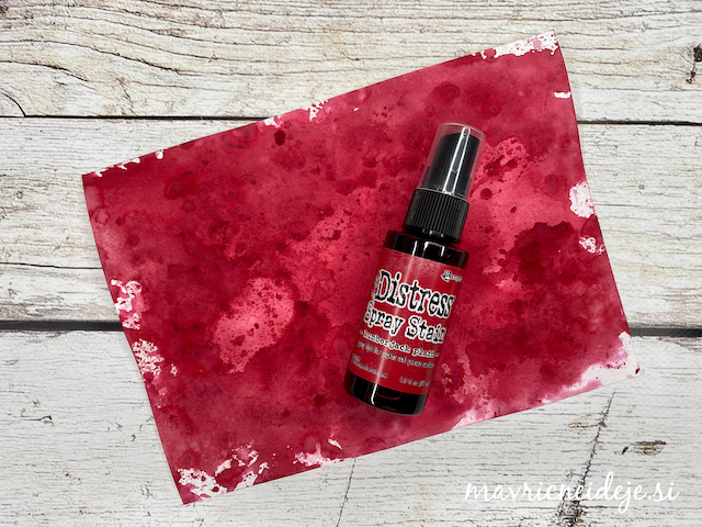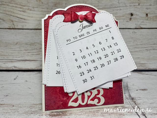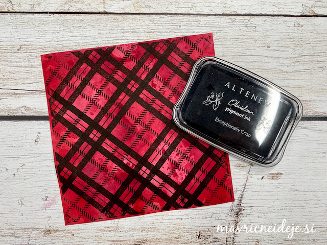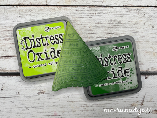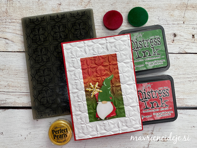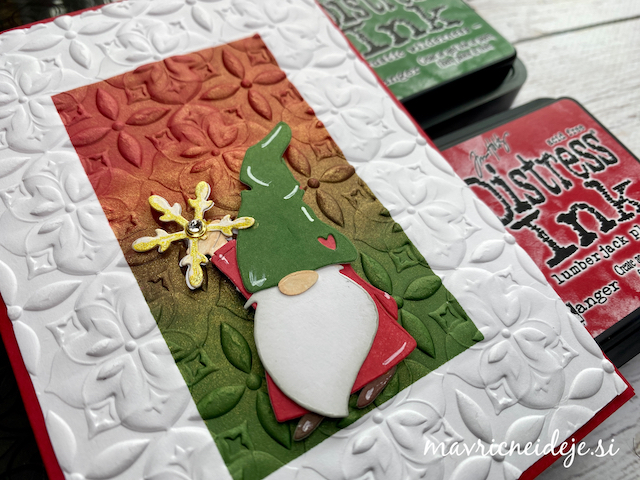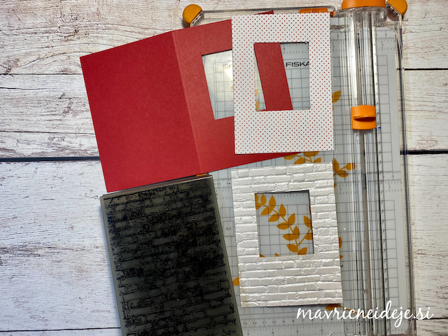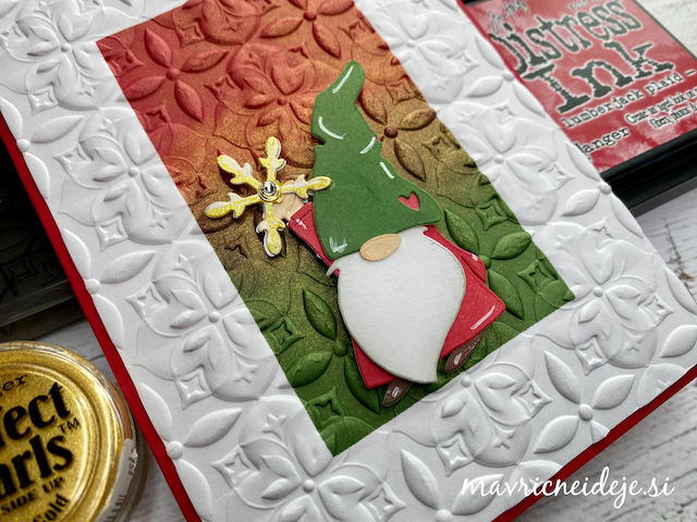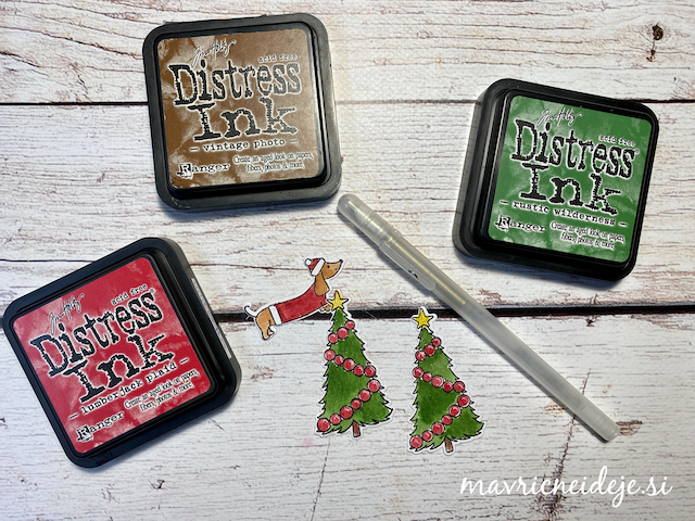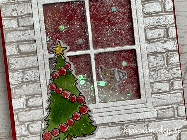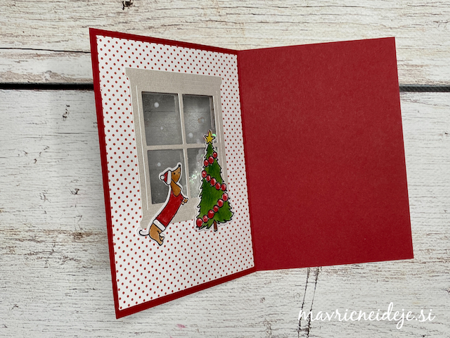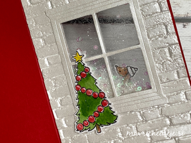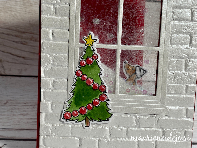 Motiva smrečico in kužka sem pobarvala z Distress inki, kužka sem na hrbtno stran dorisala, da se ga lepo vidi od zunaj in znotraj. Z rezalnikom sem na treh papirjih ( zunanji bel, osnova rdeča in notranji z vzorcem) izrezala enako veliko odprtino. Zunanjega sem še embosirala in skupaj z okenskim okvirjem sestavila tresočko.