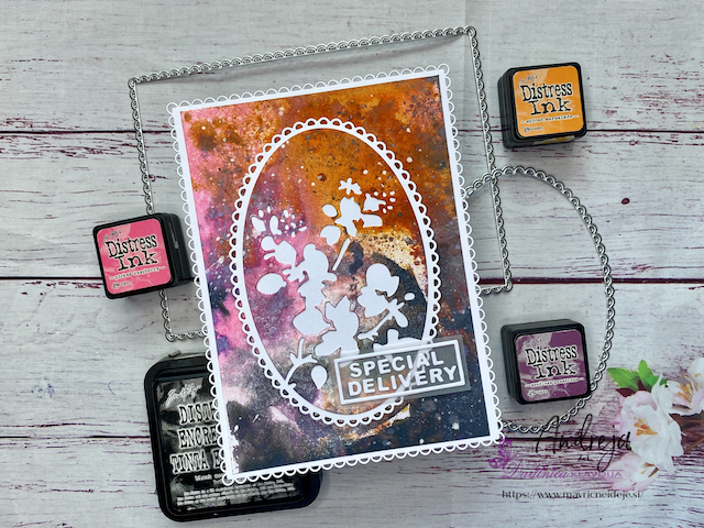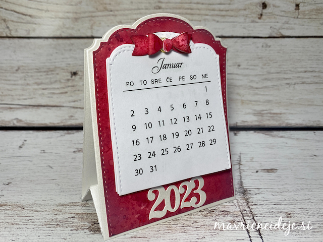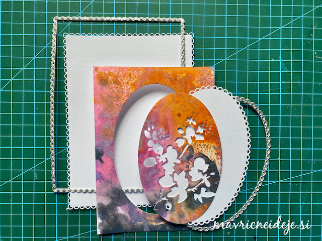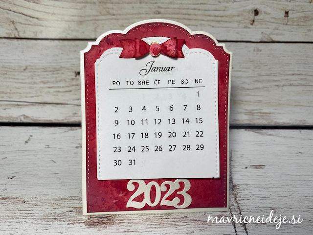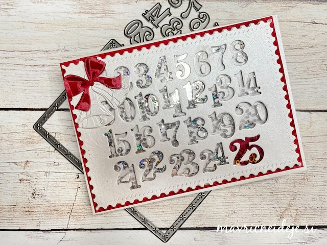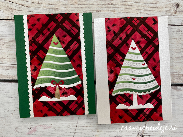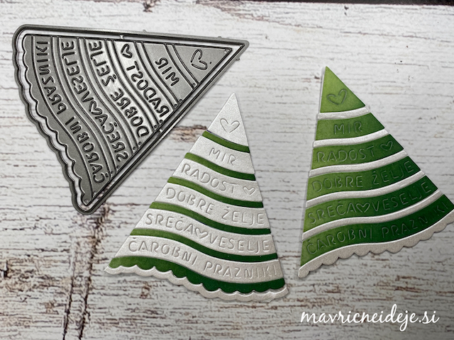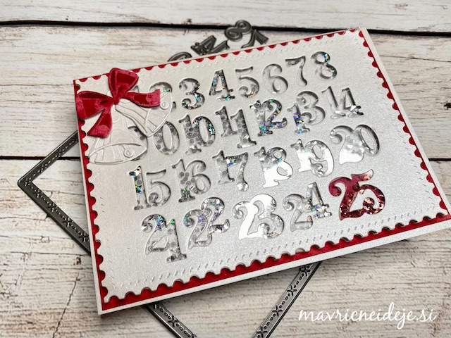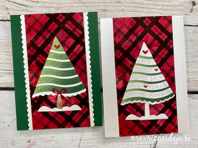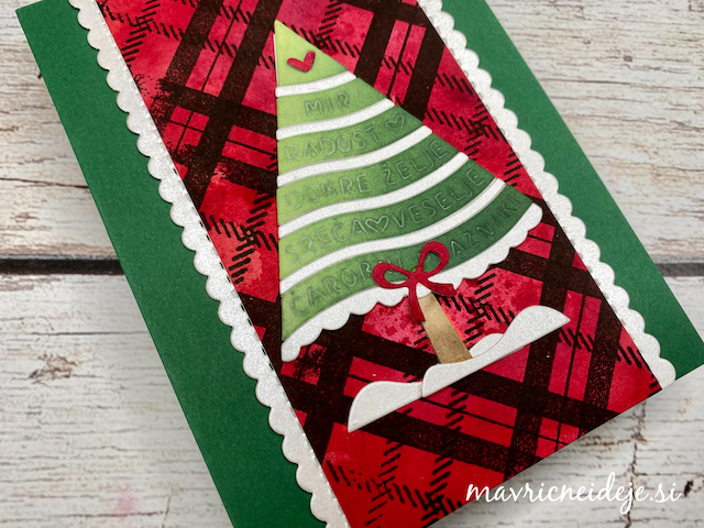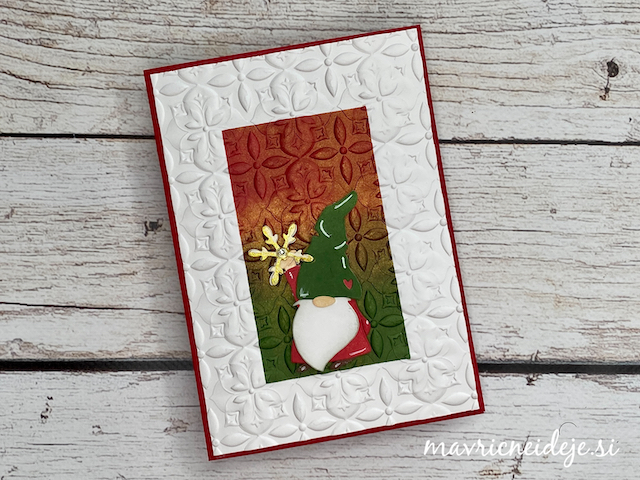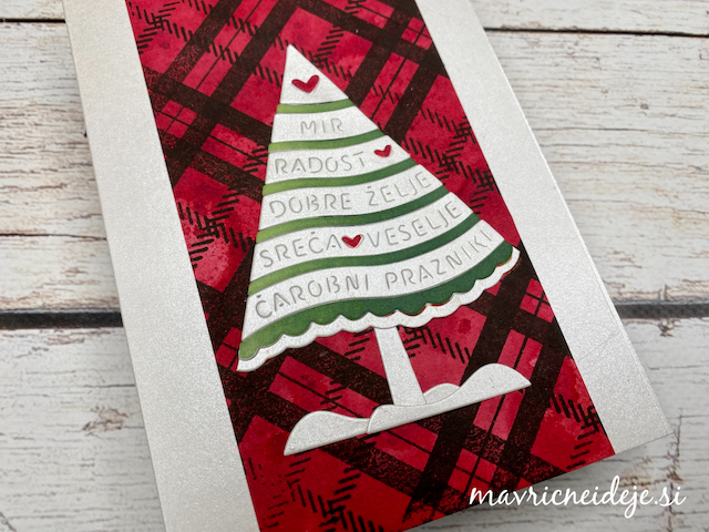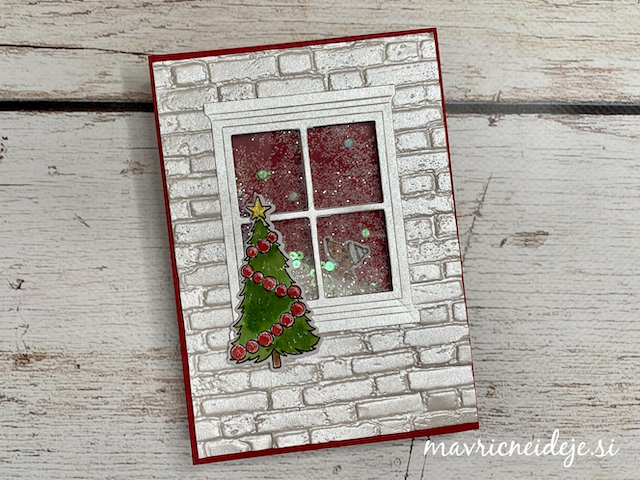 Motiva smrečico in kužka sem pobarvala z Distress inki, kužka sem na hrbtno stran dorisala, da se ga lepo vidi od zunaj in znotraj. Z rezalnikom sem na treh papirjih ( zunanji bel, osnova rdeča in notranji z vzorcem) izrezala enako veliko odprtino. Zunanjega sem še embosirala in skupaj z okenskim okvirjem sestavila tresočko.