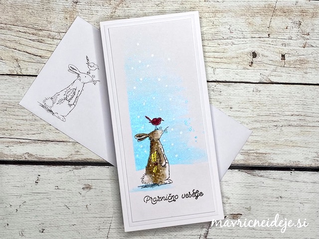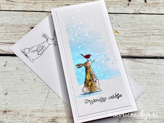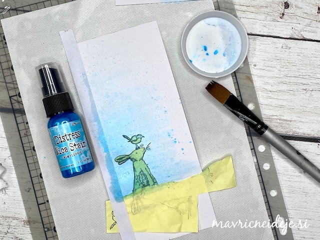 Motiv zajca in ptička sem odtisnila na akvarelni in maskirni papi. Izrez iz maskirneha papirja sem položila na pdtis na akvarelnem papirju in pobarvala ozadje.