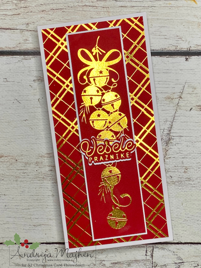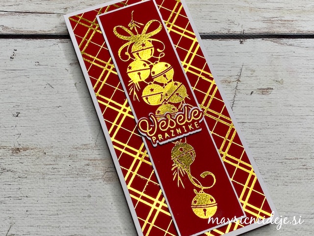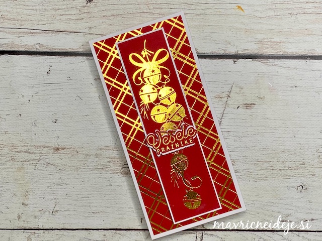 Pozdravljeni v sobotno jutro. Ta teden si je Goga zaželela DL – slimline voščilnic. Moja je rdeče-zlata, narejena samo s šablonami za vročo folijo (hot foil).