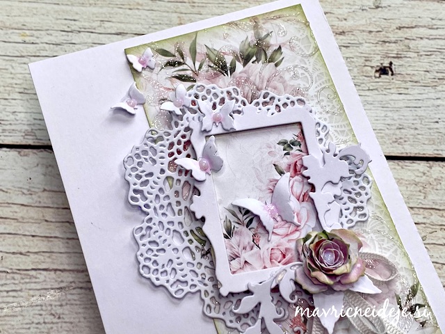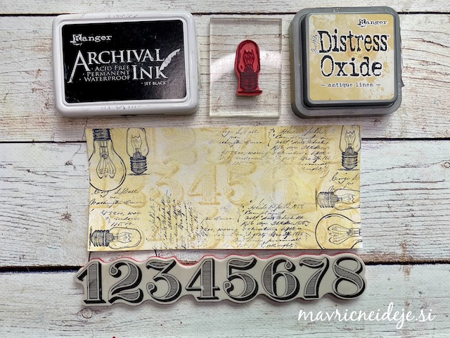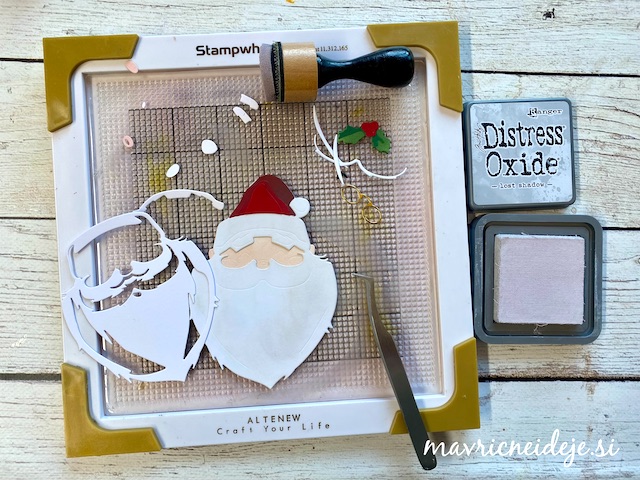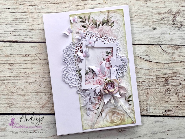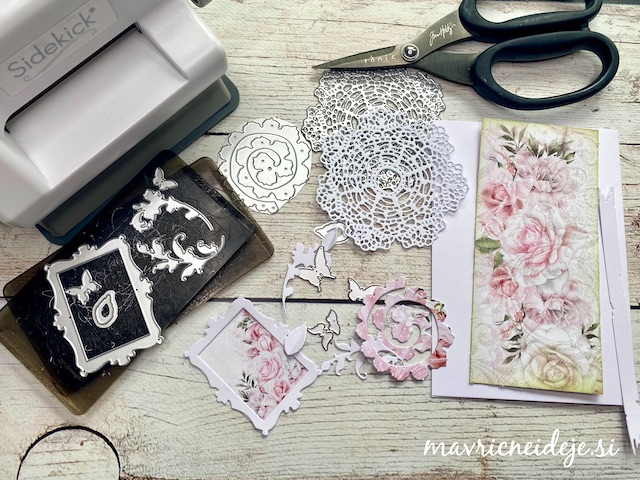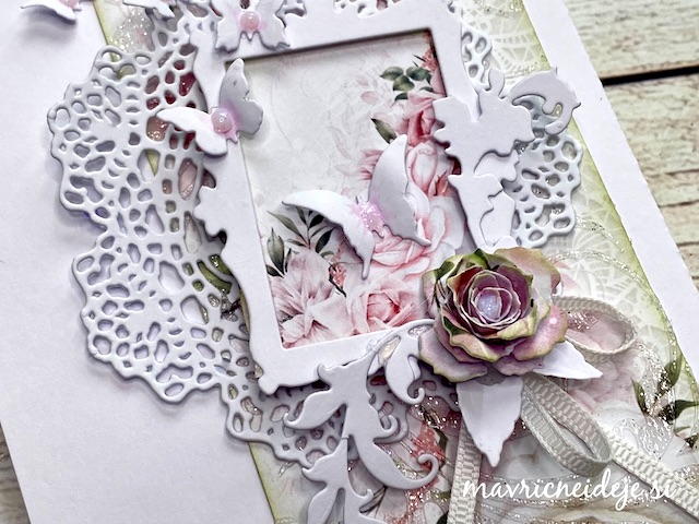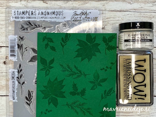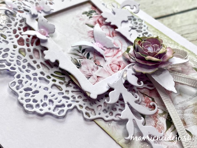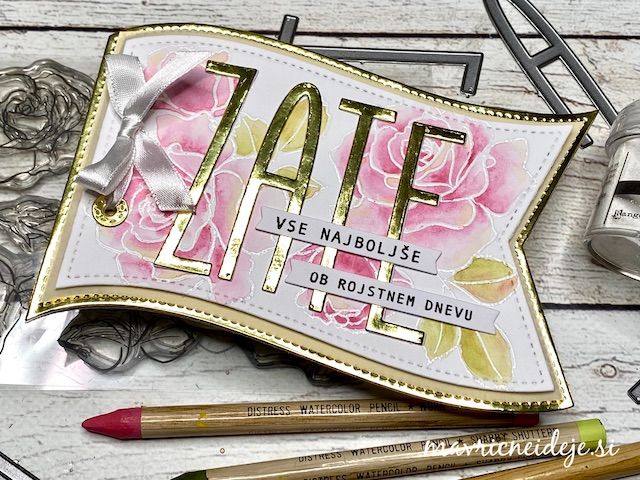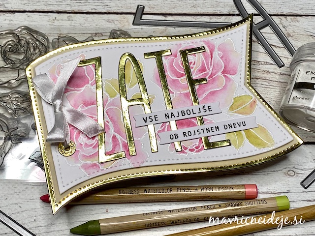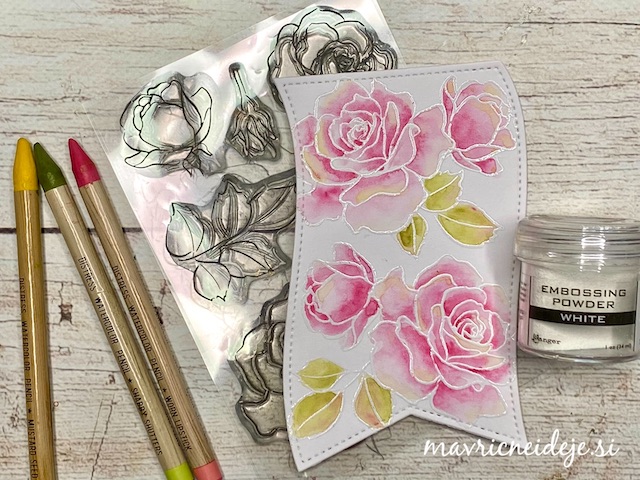 Iz akvarelnega papirja sem izrezala zastavico in nanjo odtisnila vrtnice, ki sem jih embosirala z belim prahom. Pobarvala sem jih z Distress barvicami v akvarelni tehniki.