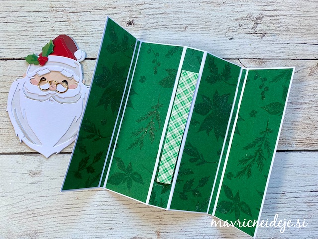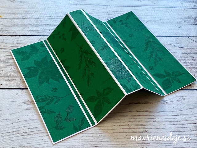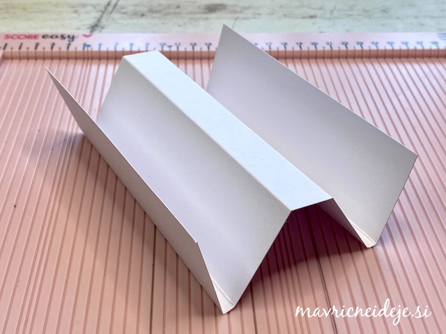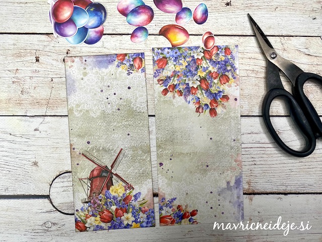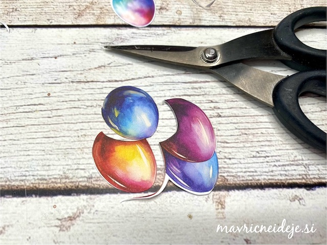 Z malce večjo šablono sem izrezala zastavico iz zlatega in pavs papirja. Slednjega sem s škarjami zmanjšala samo do roba s šivi. Tako sem dobila tri različno velike zastavice.
