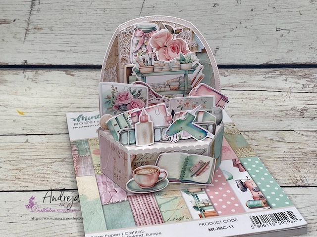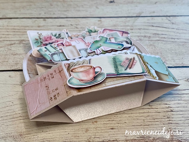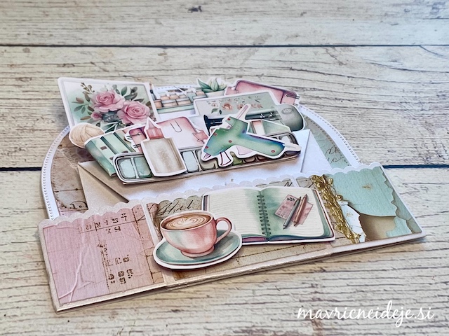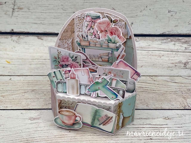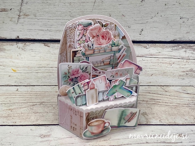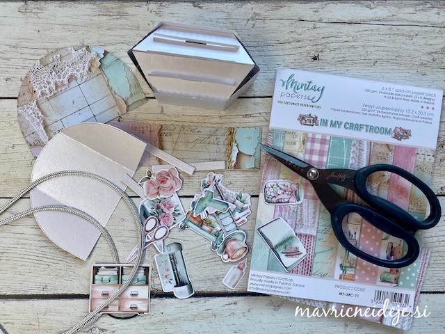 Osnovo sem si z rezalnimi šablonami izdelala iz belo perl papirja, vse ostalo pa iz Mintay papirja “In my craft room”.