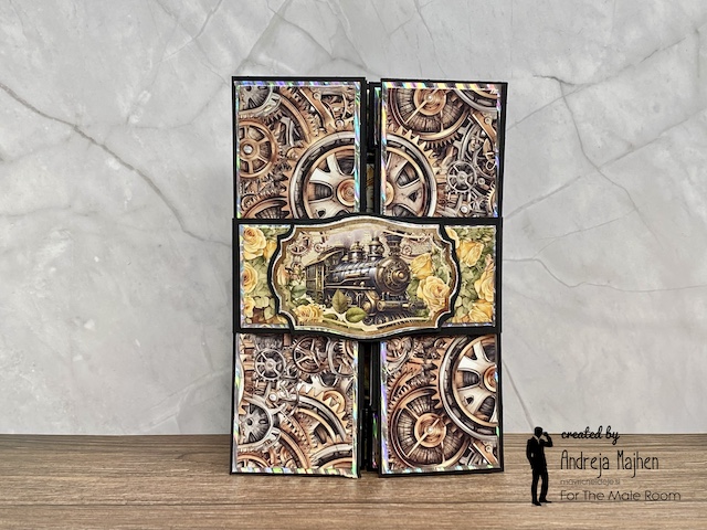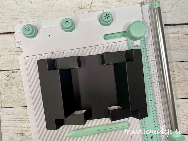 Najprej sem si s pomočjo Sizzix plošče za rezanje in prepogibanje izdelala vse potrebne elemente. Uporabila sem črn papir za osnovo in potiskan papir Scrap Boys.