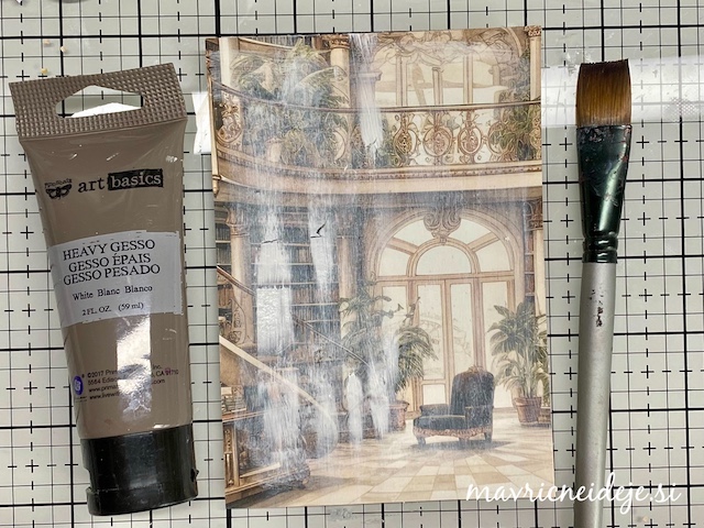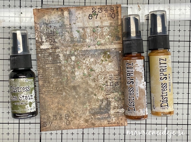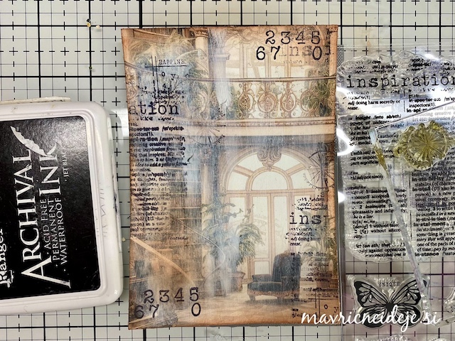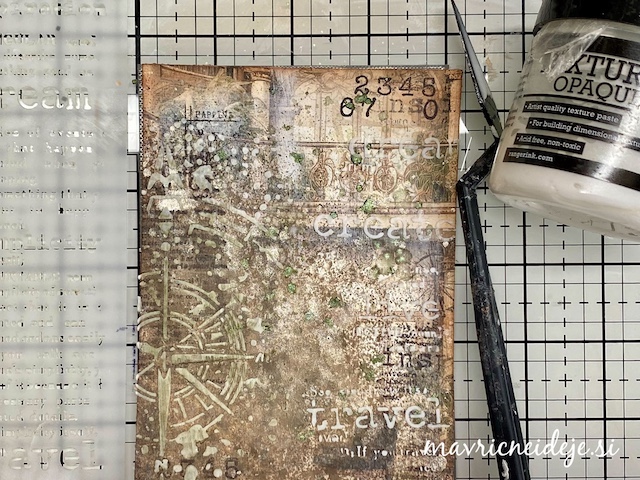 Na mixed media papir sem preko stencil šablone nanesla teksturno pasto. ko je bila pasta suhe, sem se lotila barvanja s spreji. Dodala sem še odtise štampiljk in drobne bele kapljice.