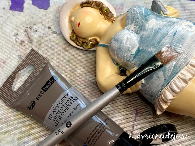 Na veliko čvrsto škatlo iz papirja sem najprej nanesla črn gesso premaz. Tako sem poenotila različne površine, saj je bila škatla potiskana z gladkim in mat potiskom.