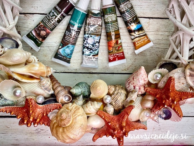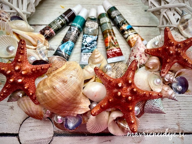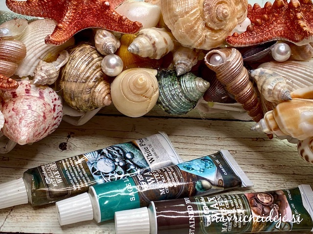 Zunanjost škatle sem najprej pobarvala z res močno razredčemo belo perl akrilno barvo, da je dobila nežen kovinski sijaj.