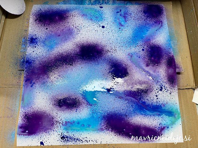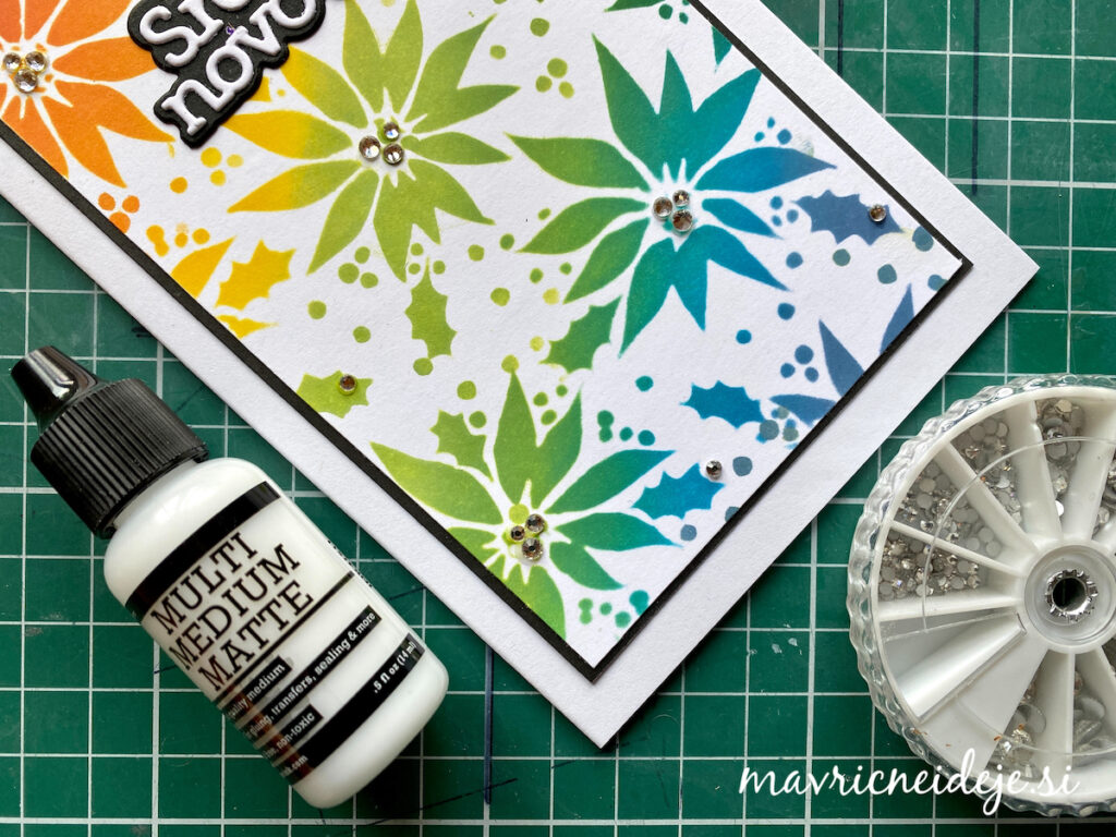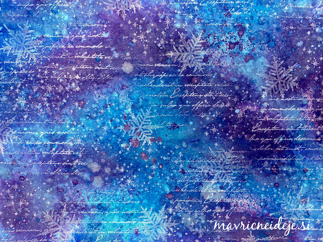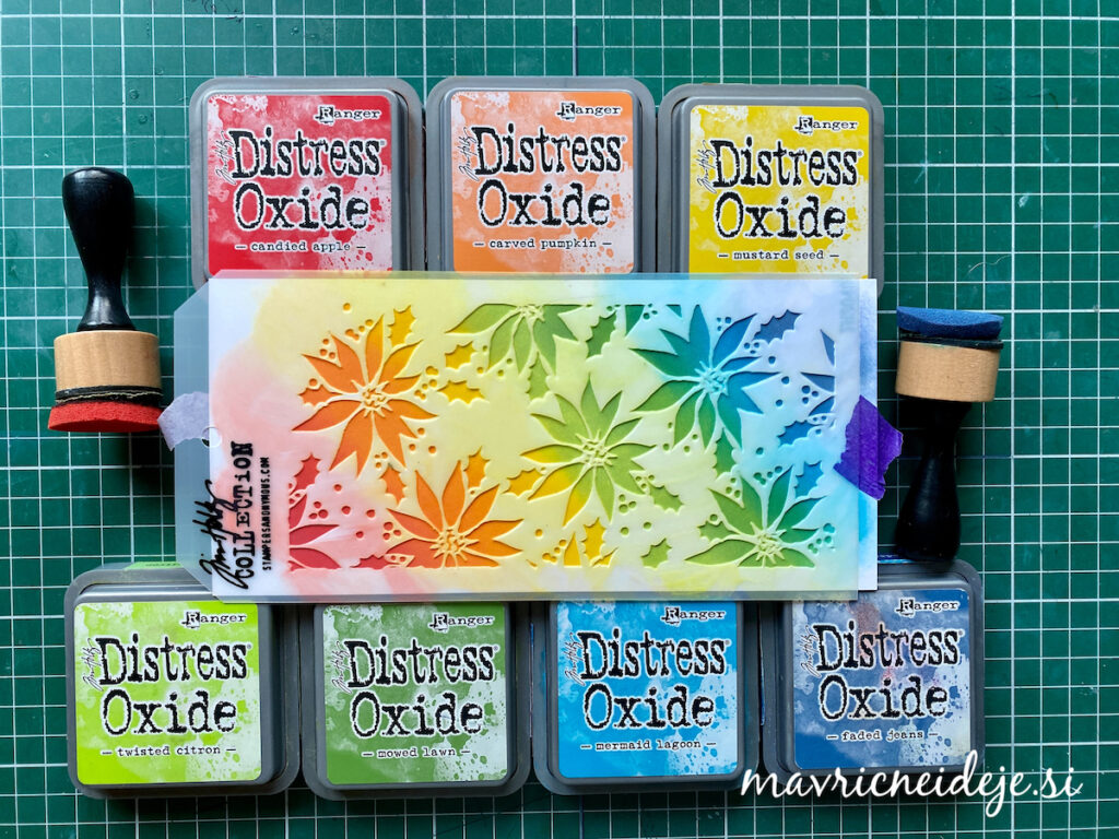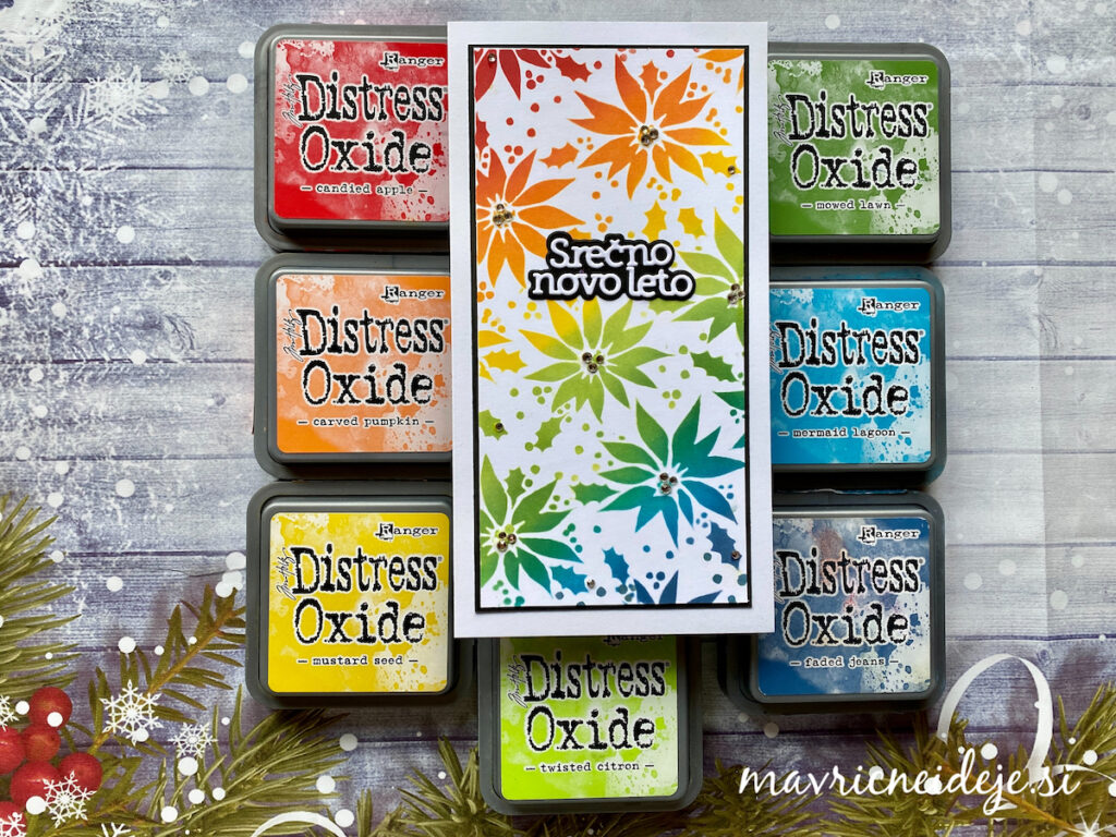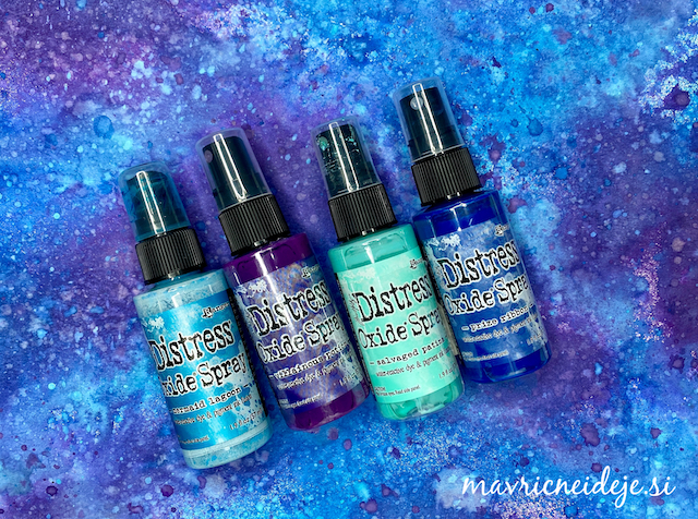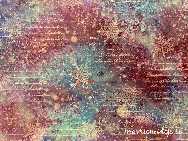 Akvarelni papir velikosti 30×30 cm, ki sem ga pobarvala z Distress spreji sem uporabila za izreze listov. Kombinirala sem Oxide, klasične in mica spreje. Prvi so mat, drugi prosojni in tretji bleščeči. Kako se lahko spreje kombinira sem pokazala TUKAJ.