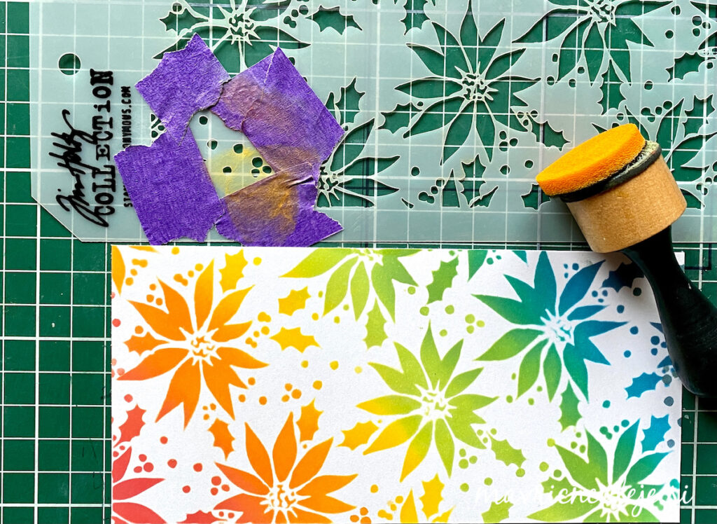 Izree sem položila na lepljivo podlaho Altenew stampwheel in nanje odtisnila ujemajoč motiv z embosing blazinico.