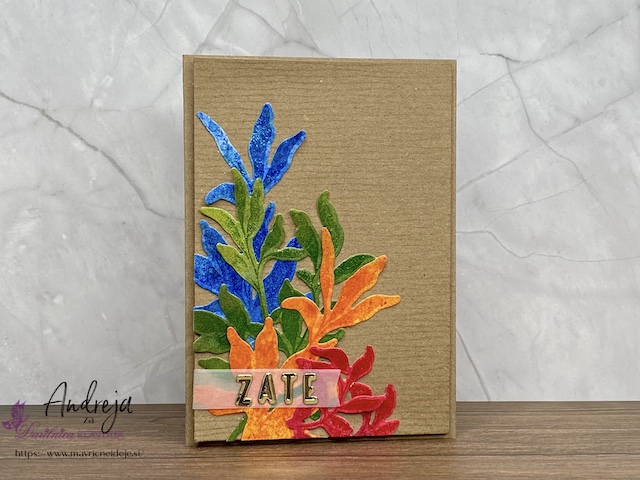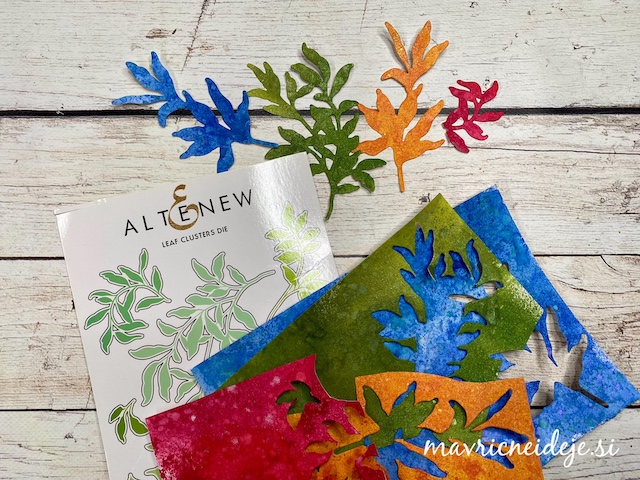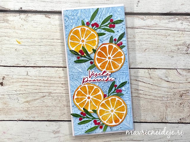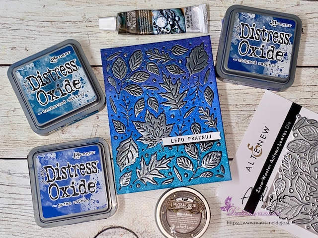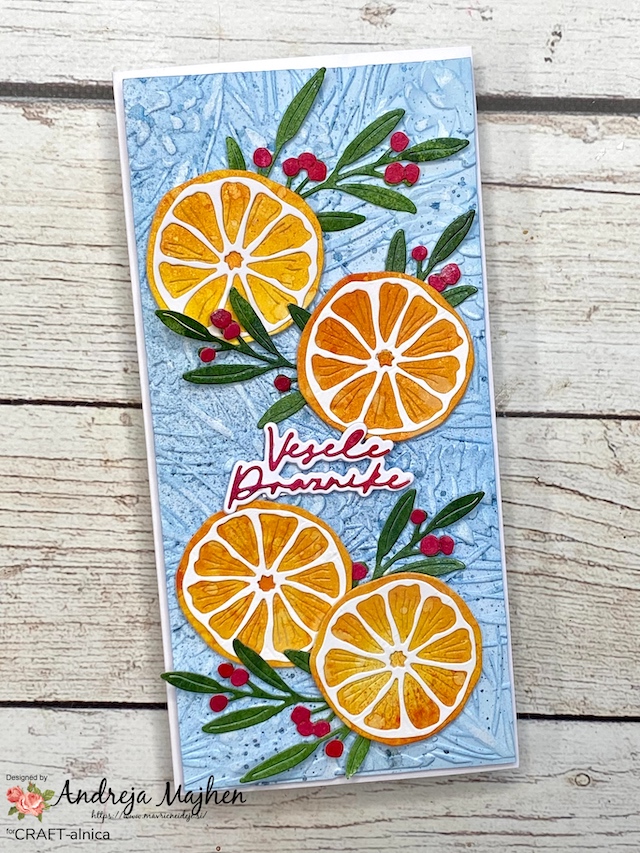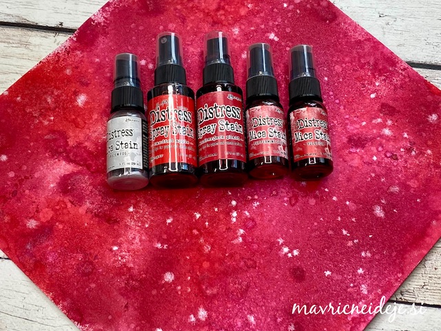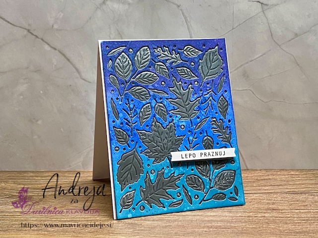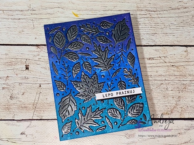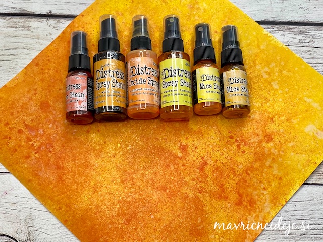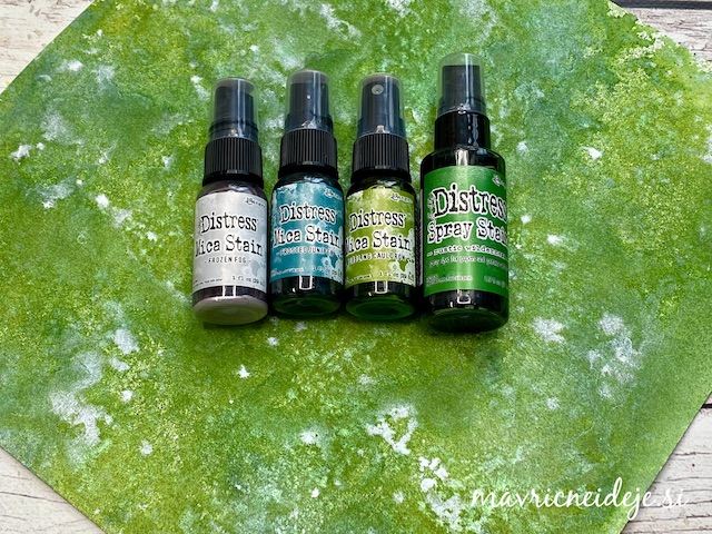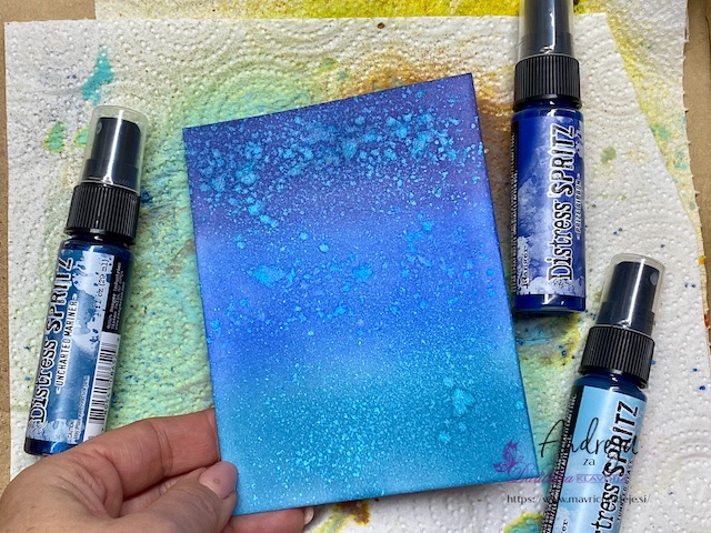 Na mixed media papir sem preko stencil šablone nanesla teksturno pasto. ko je bila pasta suhe, sem se lotila barvanja s spreji. Dodala sem še odtise štampiljk in drobne bele kapljice.