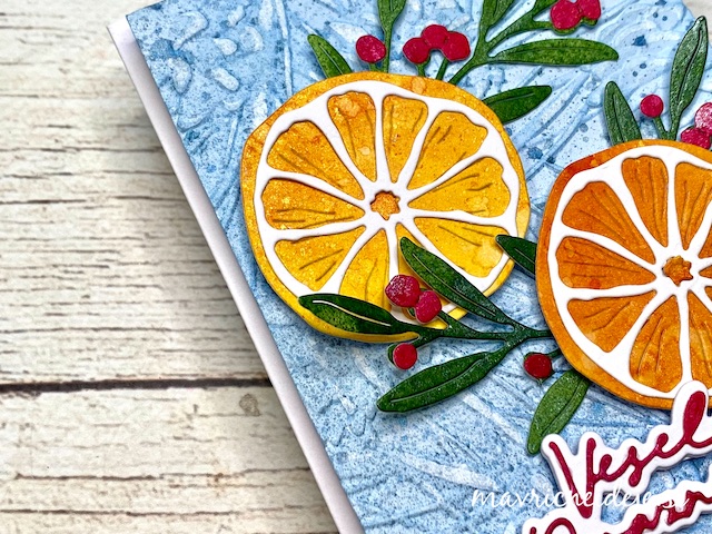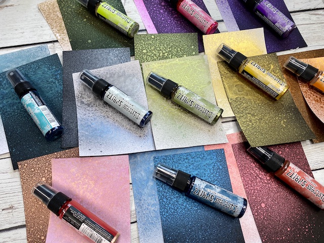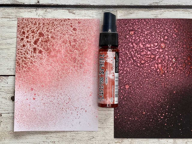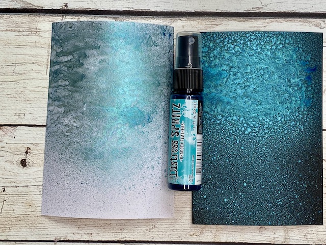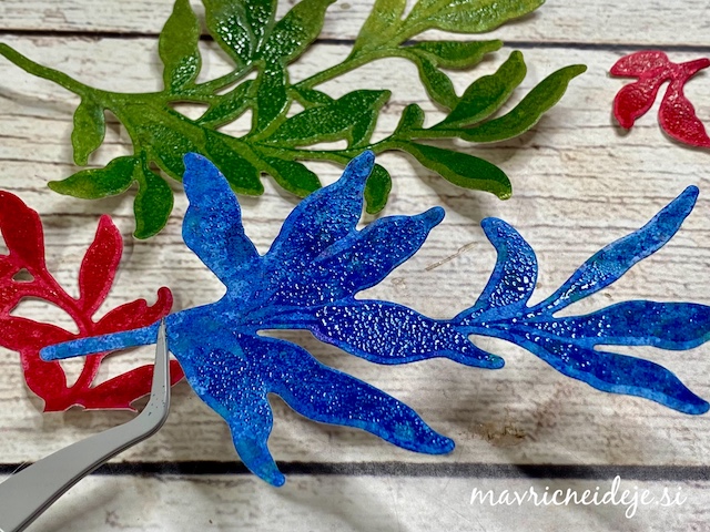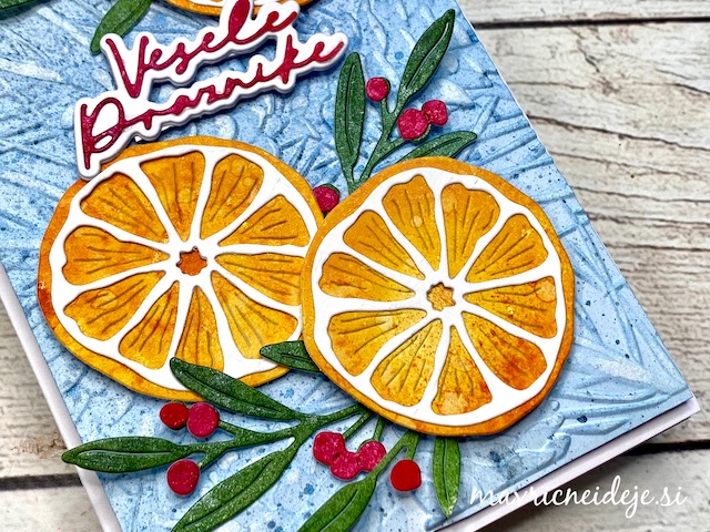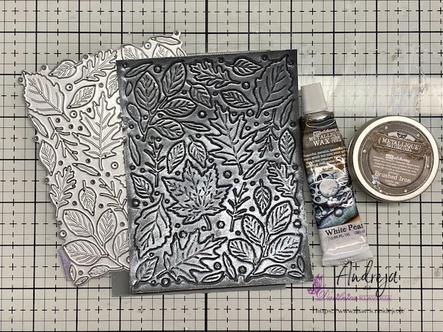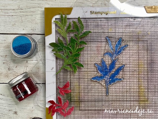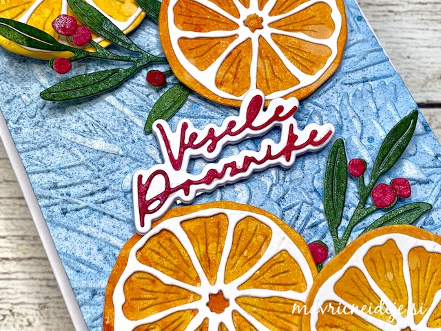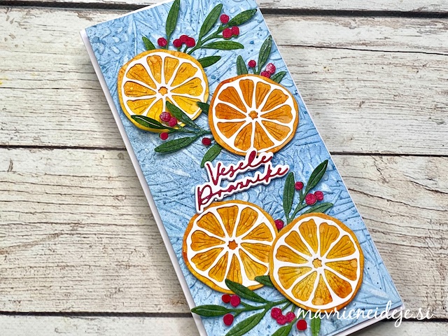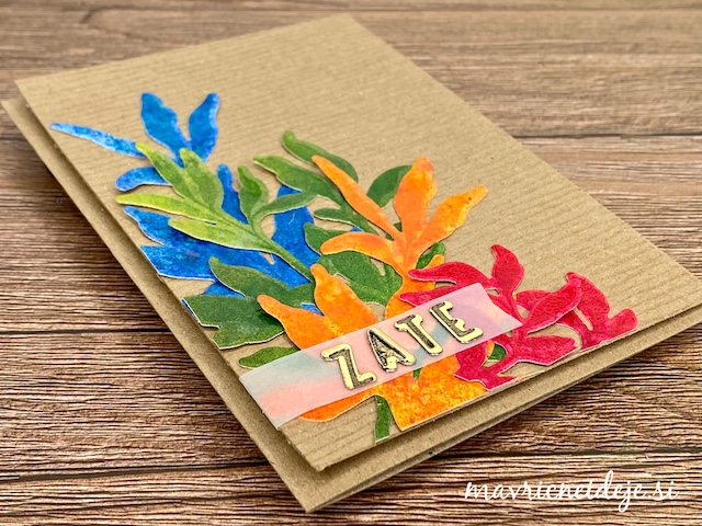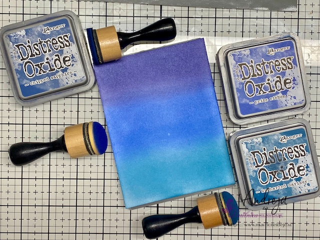 Na mixed media papir sem preko stencil šablone nanesla teksturno pasto. ko je bila pasta suhe, sem se lotila barvanja s spreji. Dodala sem še odtise štampiljk in drobne bele kapljice.