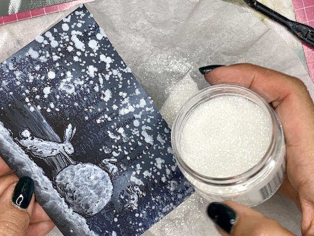 Na snežinko sem dodala prozorne bleščice – kamnečke in v prahu.