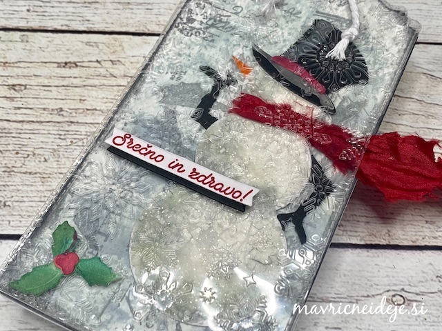 Za lepljenje snežinke na pokrov škatle sem uporabila močno mixed media lepilo.
