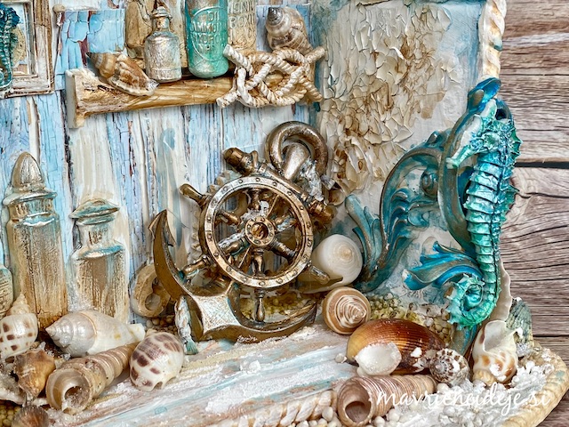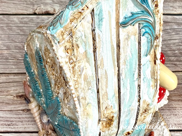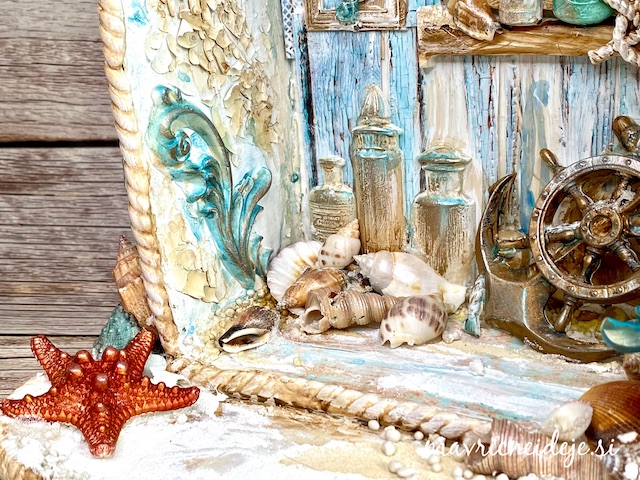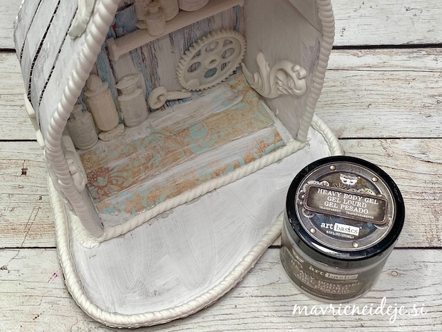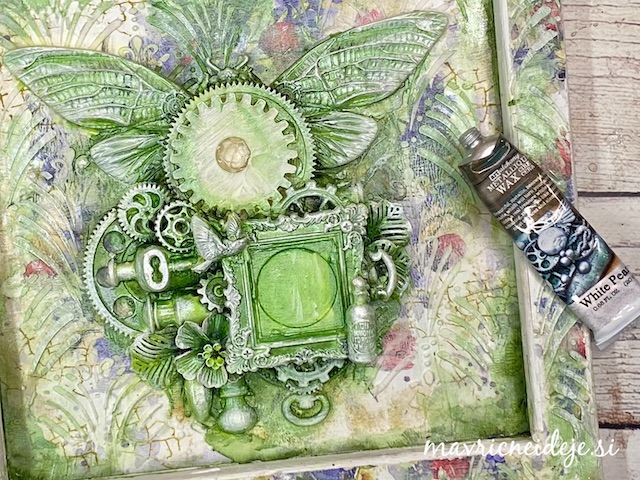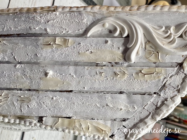 Zunanjost škatle sem najprej pobarvala z res močno razredčemo belo perl akrilno barvo, da je dobila nežen kovinski sijaj.
