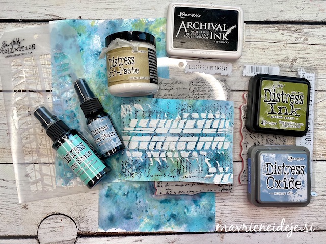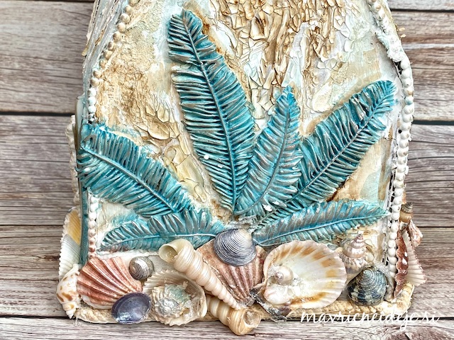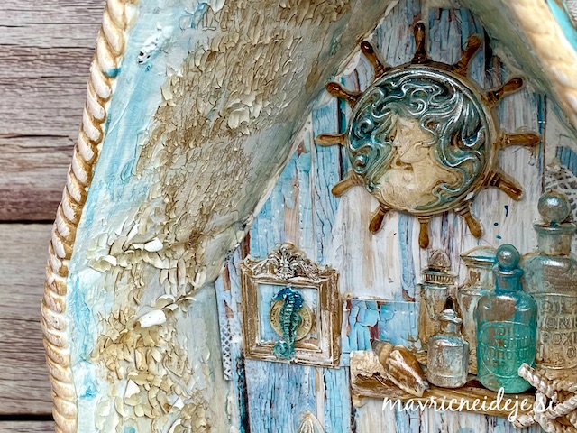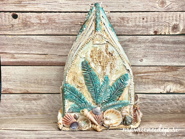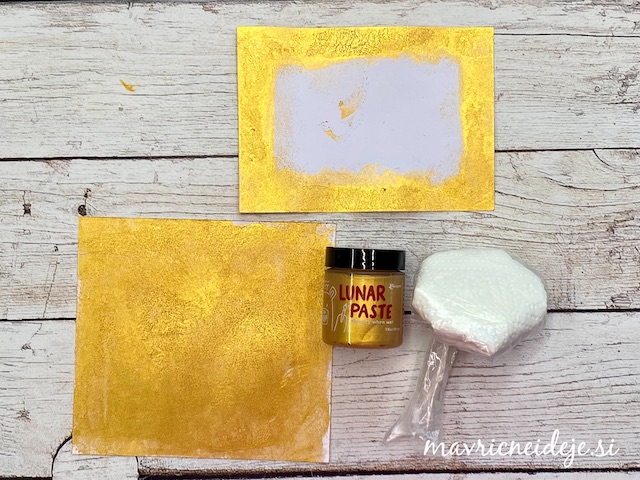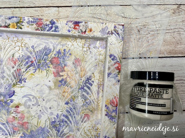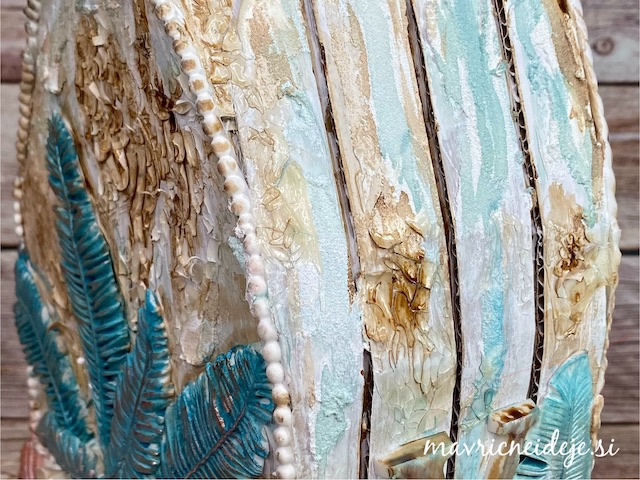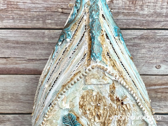 Preko stencil šablone sem na zunanjost nanesla belo teksturno pasto.