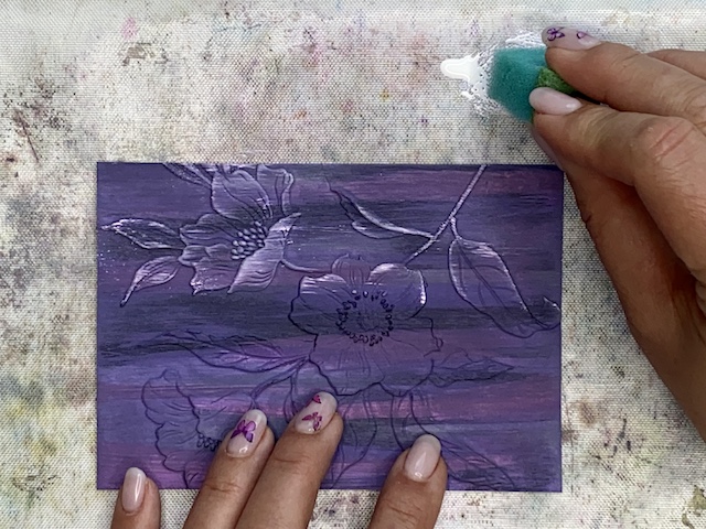 Polnila za barvne blazinice ponavadi res uporabimo le za to, da z njimi osvežimo porabljene ali izsušene blazinice. Tokrat sem jih uporabila za barvanje. Na črn papir sem jih nanašala s koščkom grobe gospodinjske gobice, da sem dobila dodatne teksture in vzorce.
