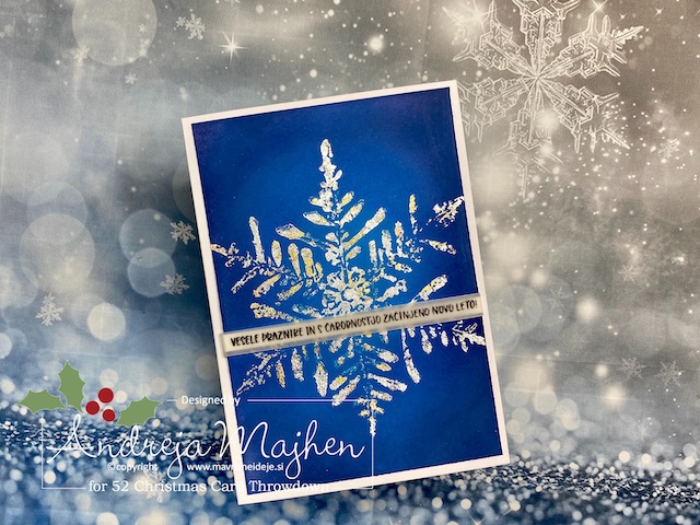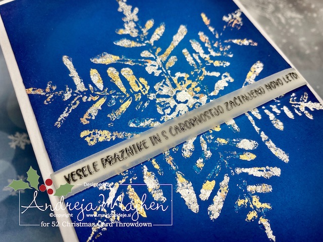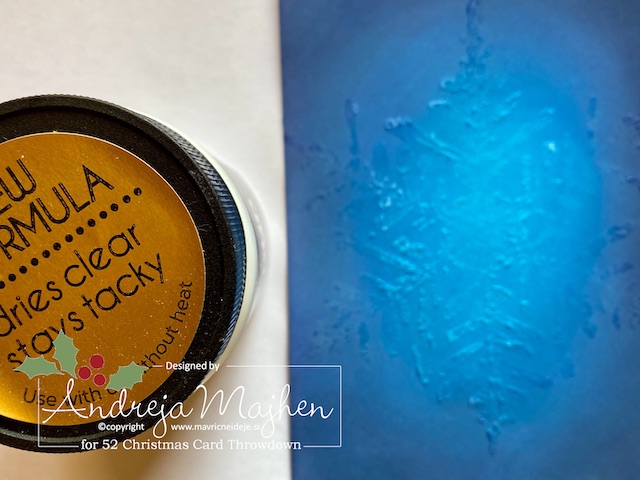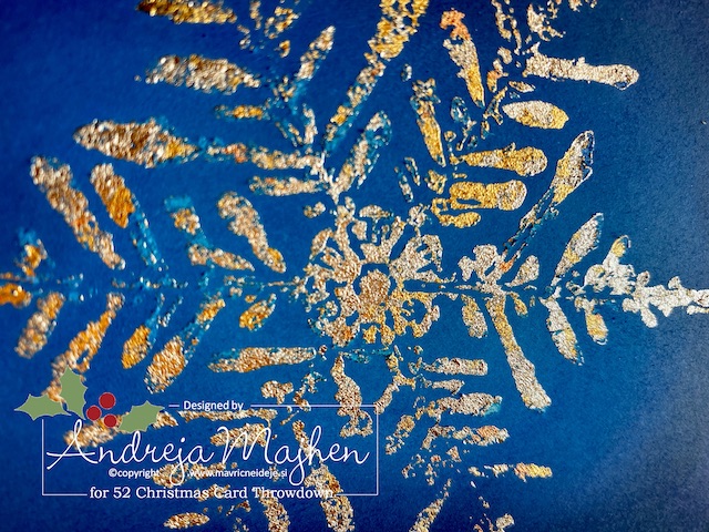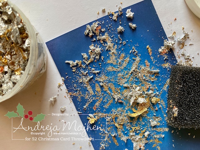 Na izbran papir sem nalepila dvostranski lepilni trak, na katerega sem s prsti nanesla in potlačila kosmiče za pozlato. Odvečne lističe sem odstranila z malo bolj grobo gobico.