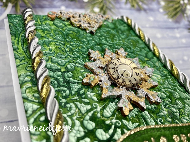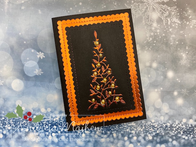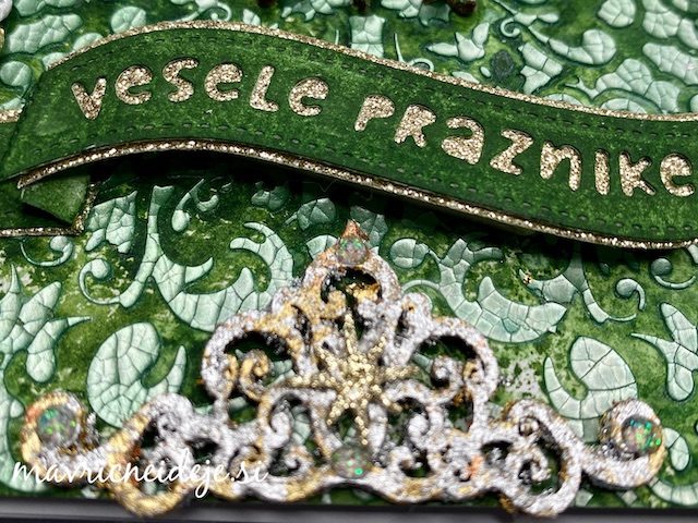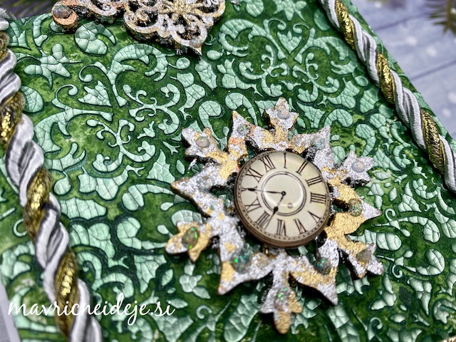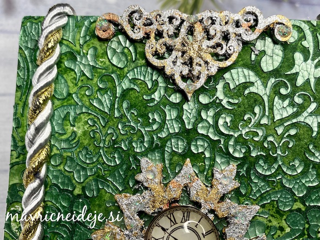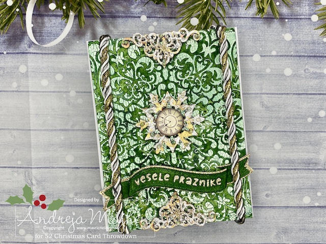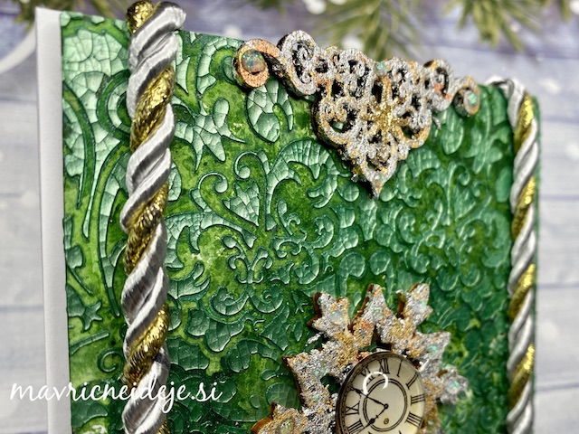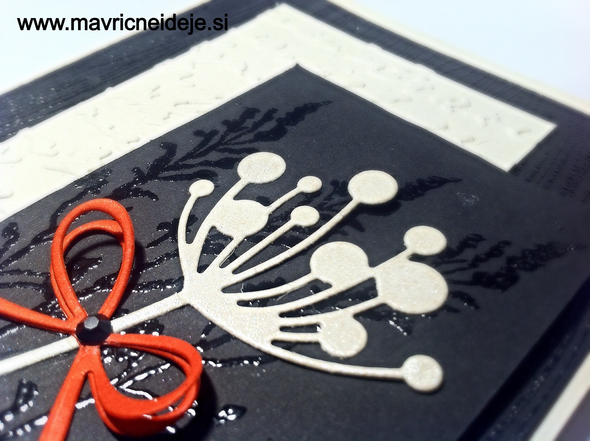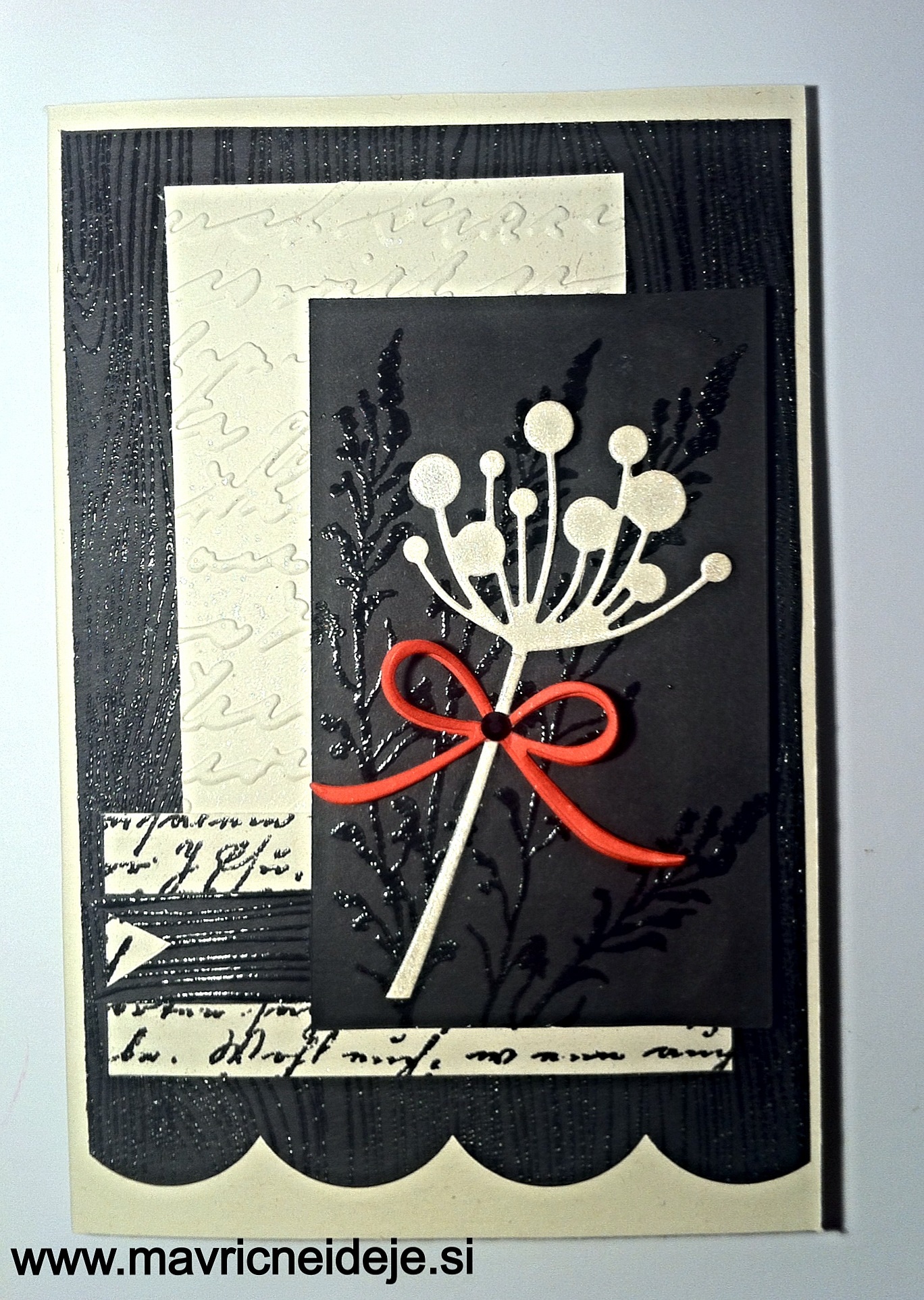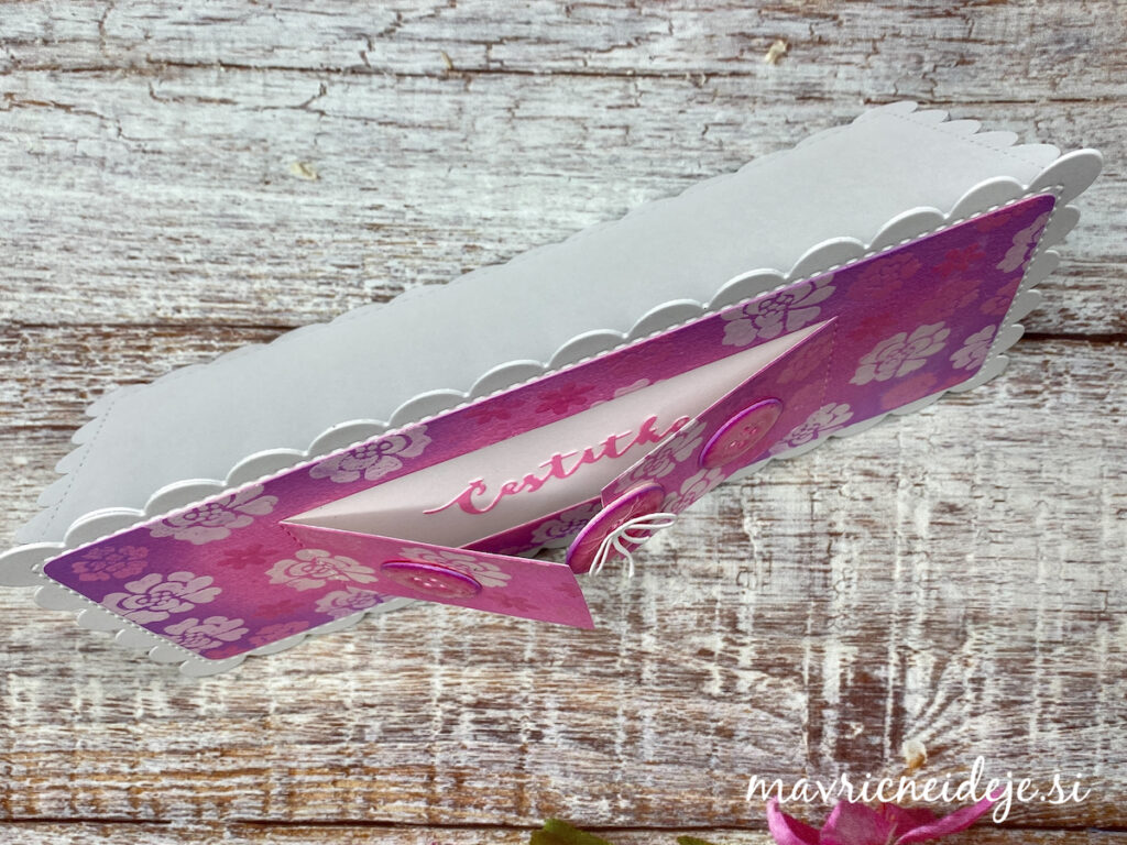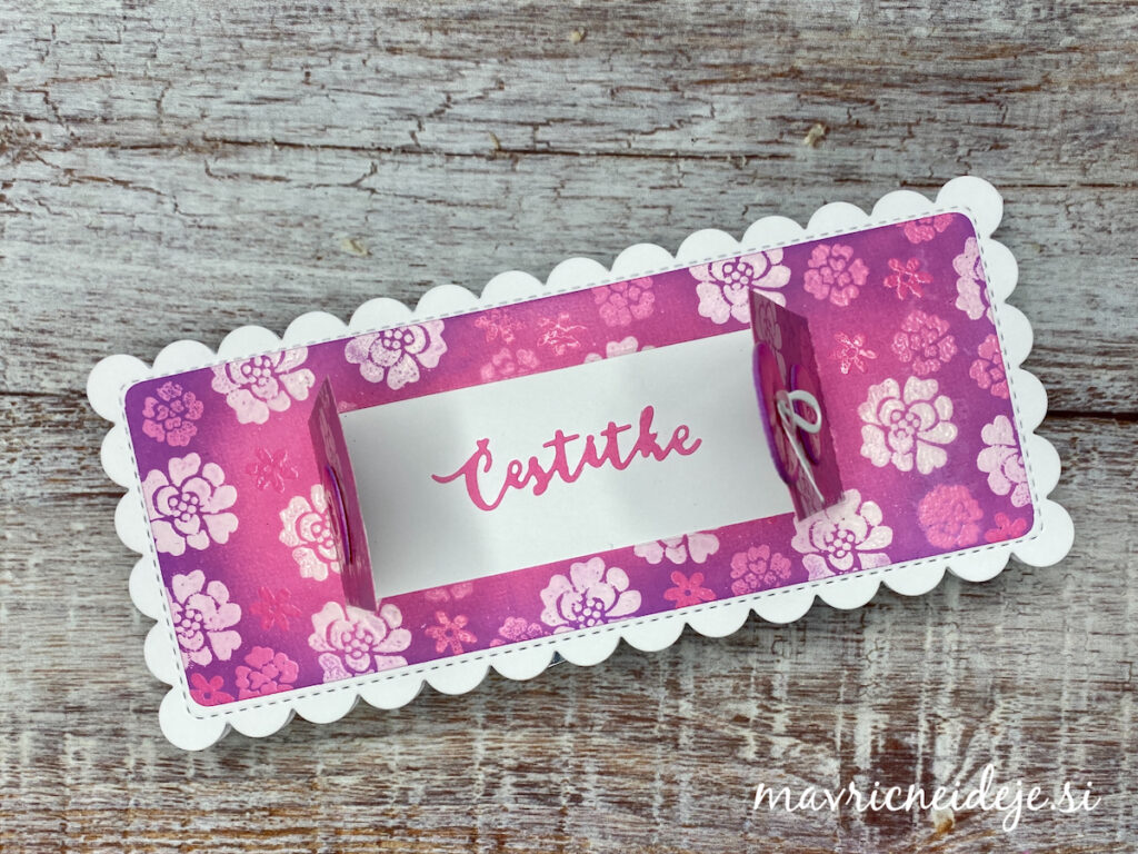 Uporabila sem rezalne šablone Najlepši Par Amerikanka 2 in iz 300g UK Craft papirja izrezala dva pravokotnika z valovitim robom ter ju sestavila v ležečo osnovo.