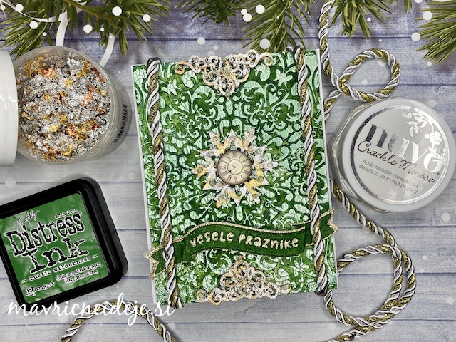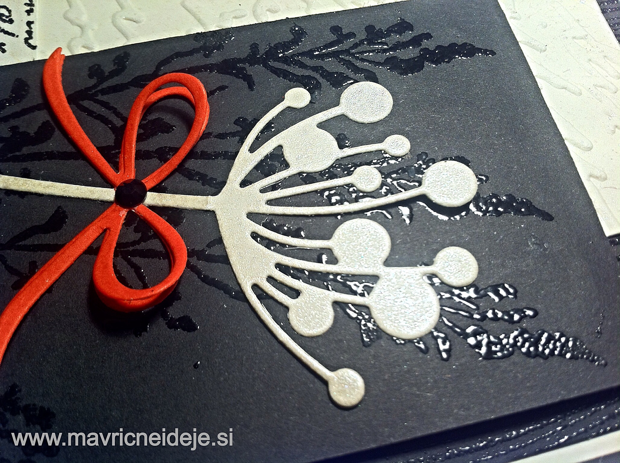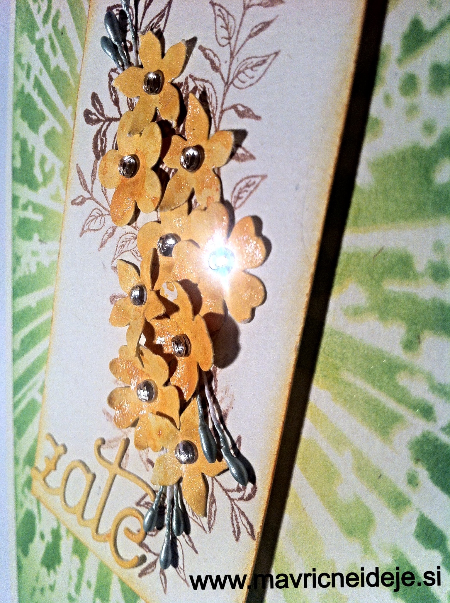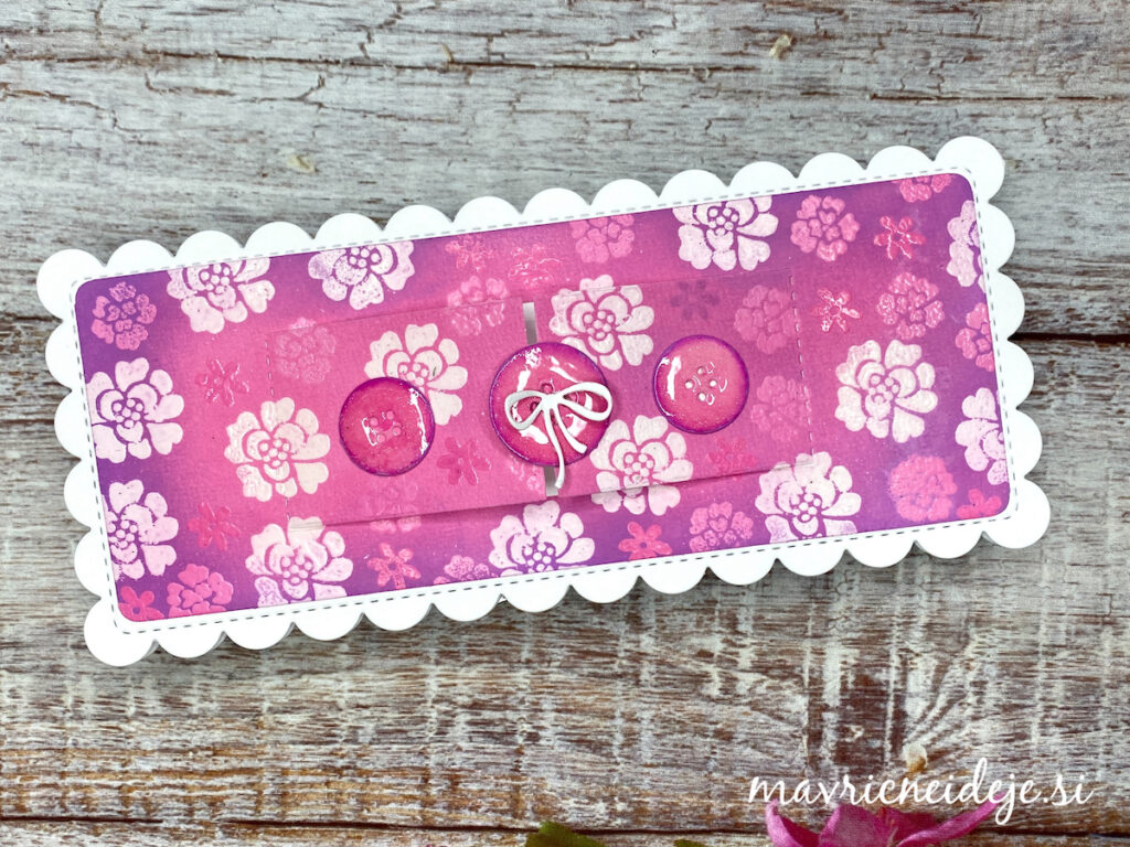 Na dodaten papir sem embosirala odtise rožic iz seta Okrasimo s cvetjem, in ga pobarvala z Distress Oxide picker raspberry, nato sem odtisnila in embosirala drugo plas rožic, jih embosirala in ponovila nanos barve. vse skupaj sem ponovila še tretjič in robove osenčila z Distress Oxide Wilted violet.