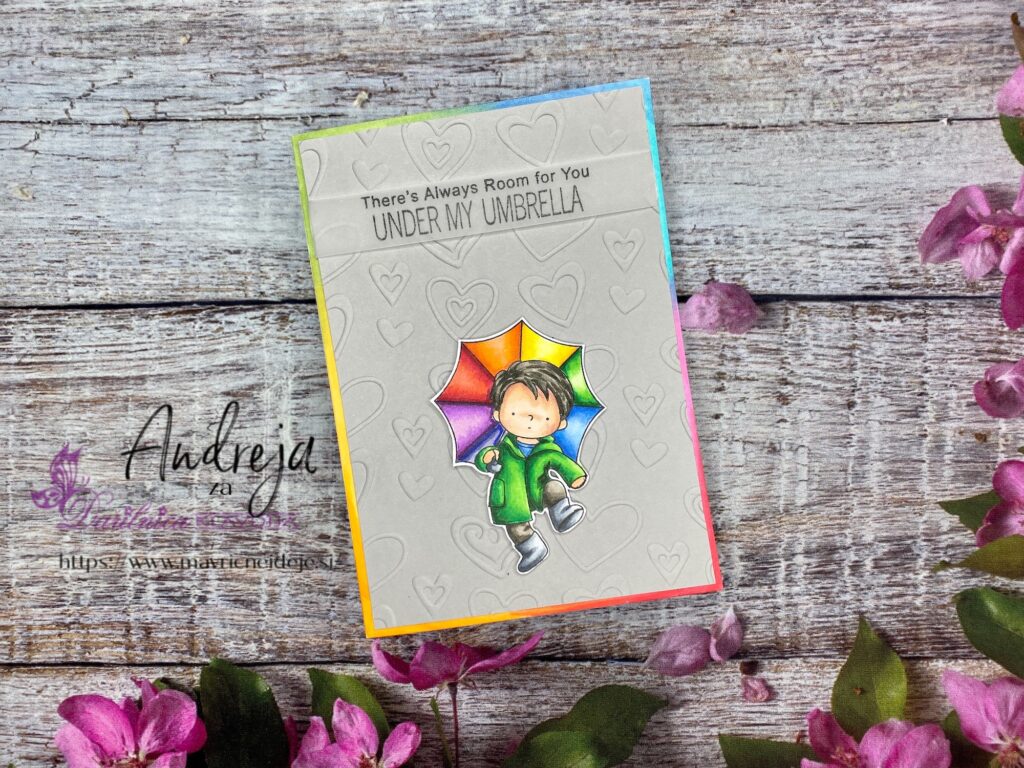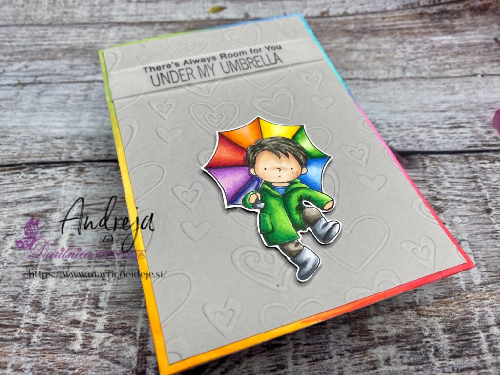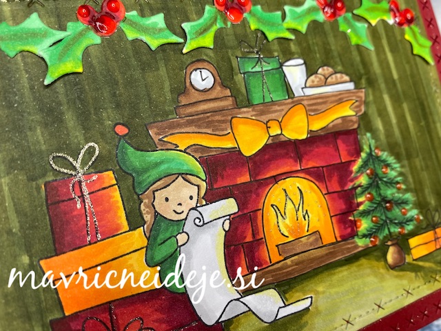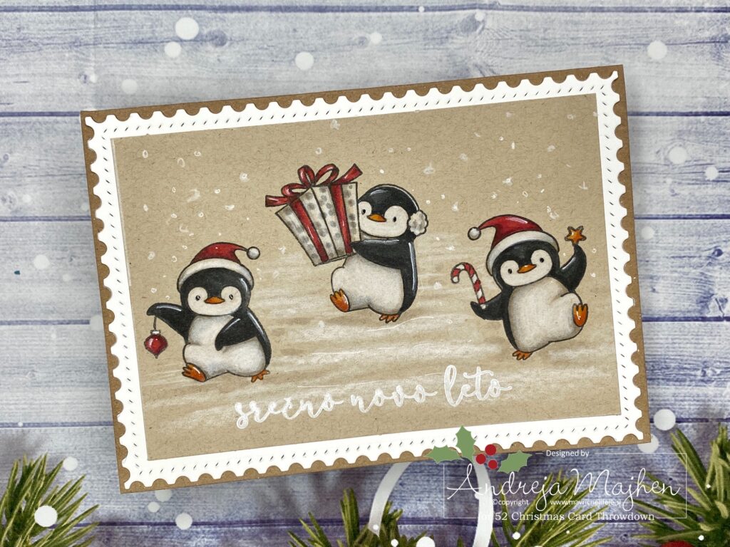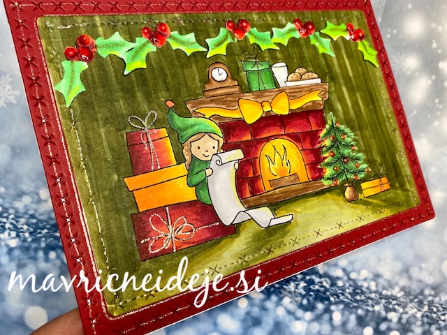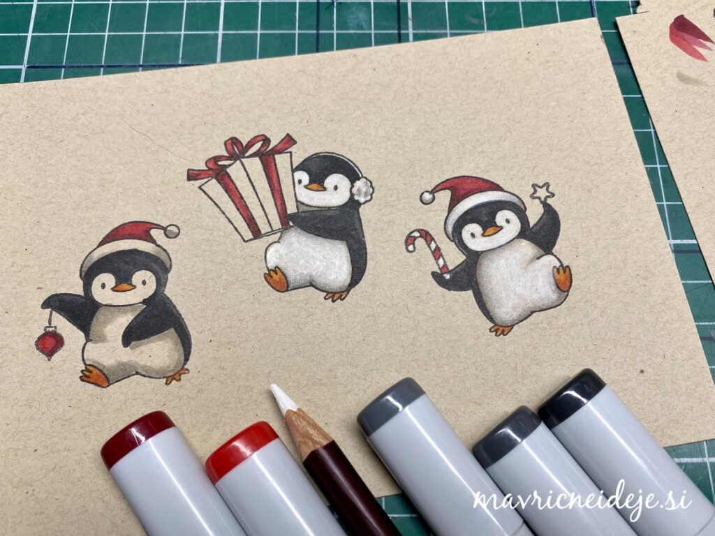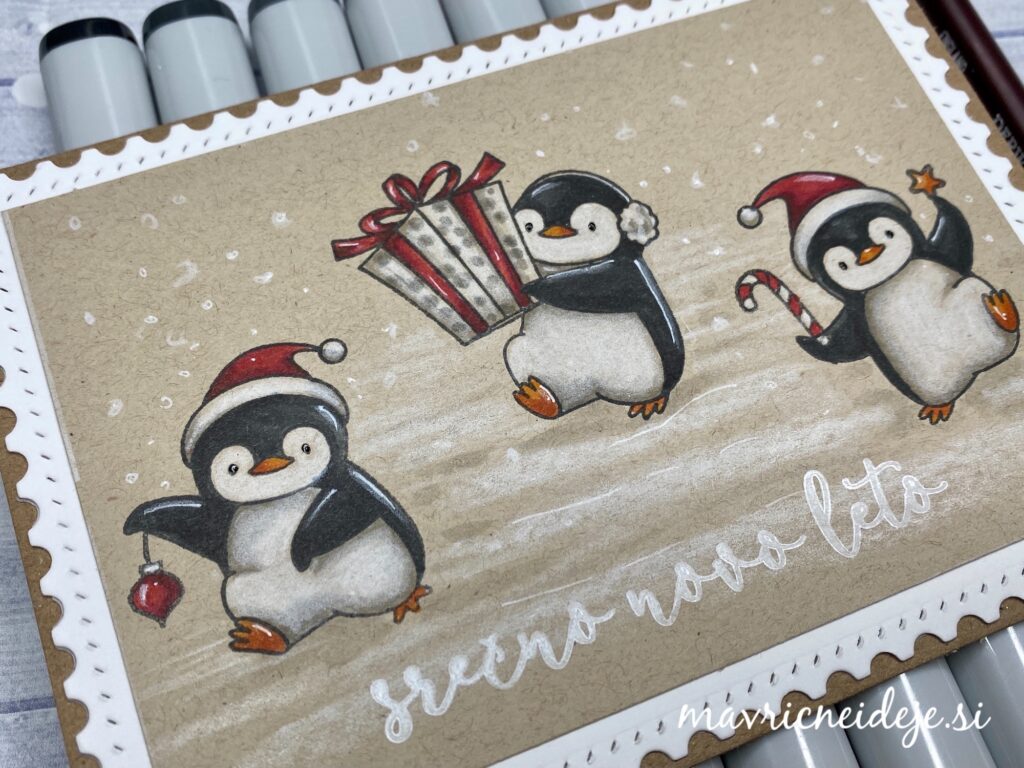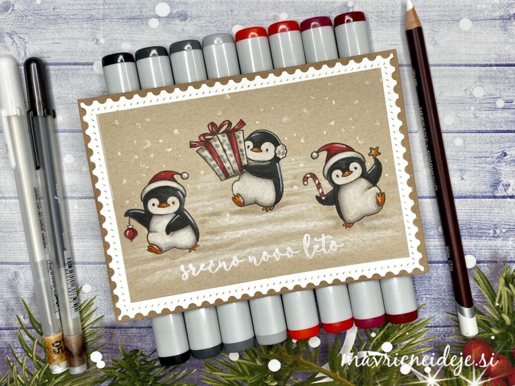Na Color Copy 300 g papir sem s črno Memento blazinico odtisnila zmajčka (MFT stamp). Barvala sem s Copic markerji (alkoholni markerji) in dodala bele iskrice s Sakura Gelly Roll belim markerjem. Košček papirja sem prav tako pobarvala z markerji in nato voščilo izrezala s šablono Najlepši Par.