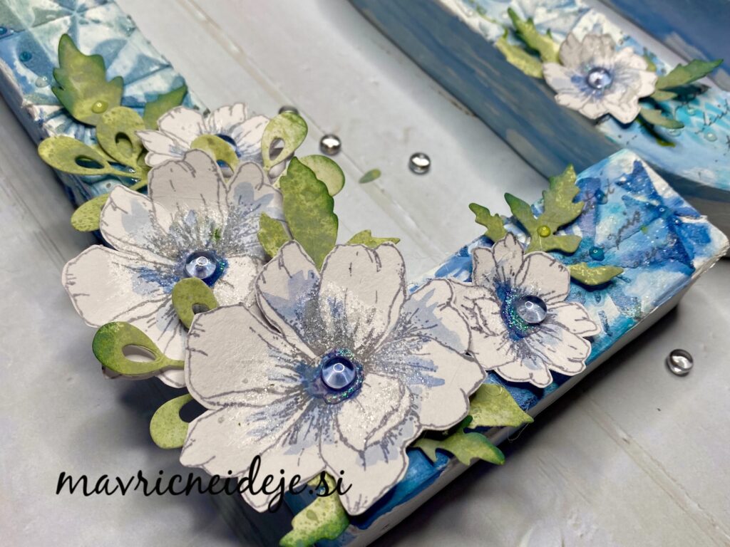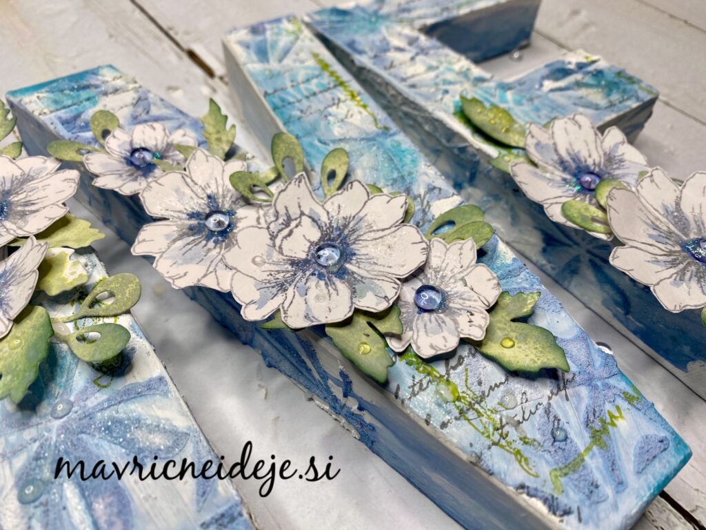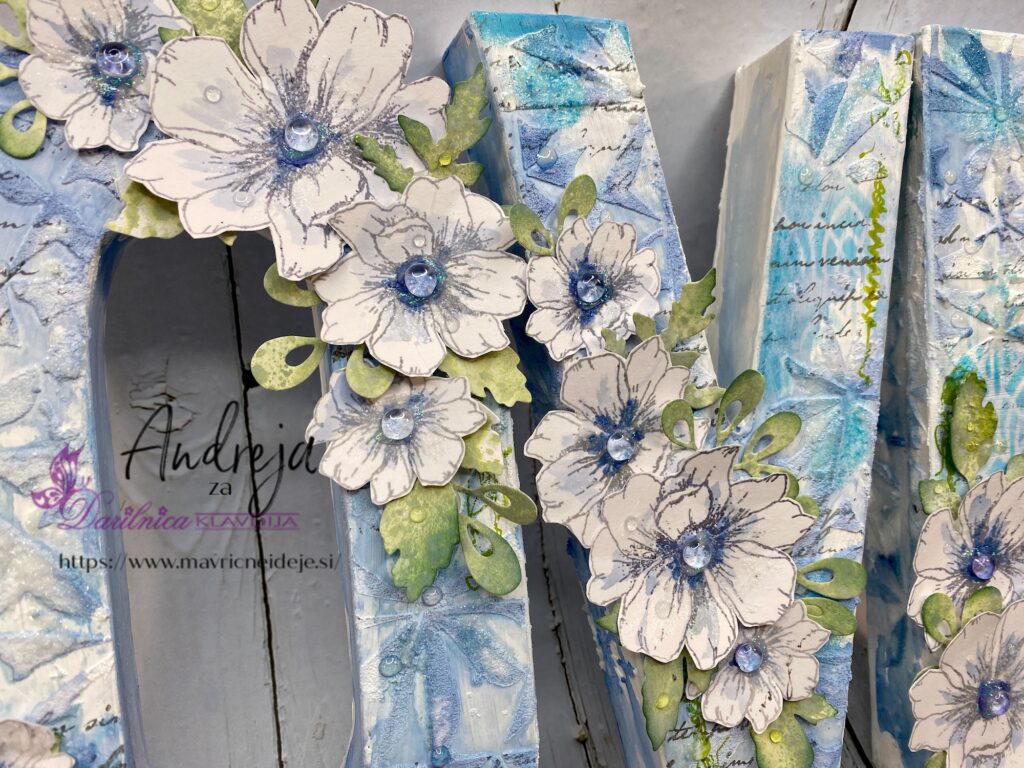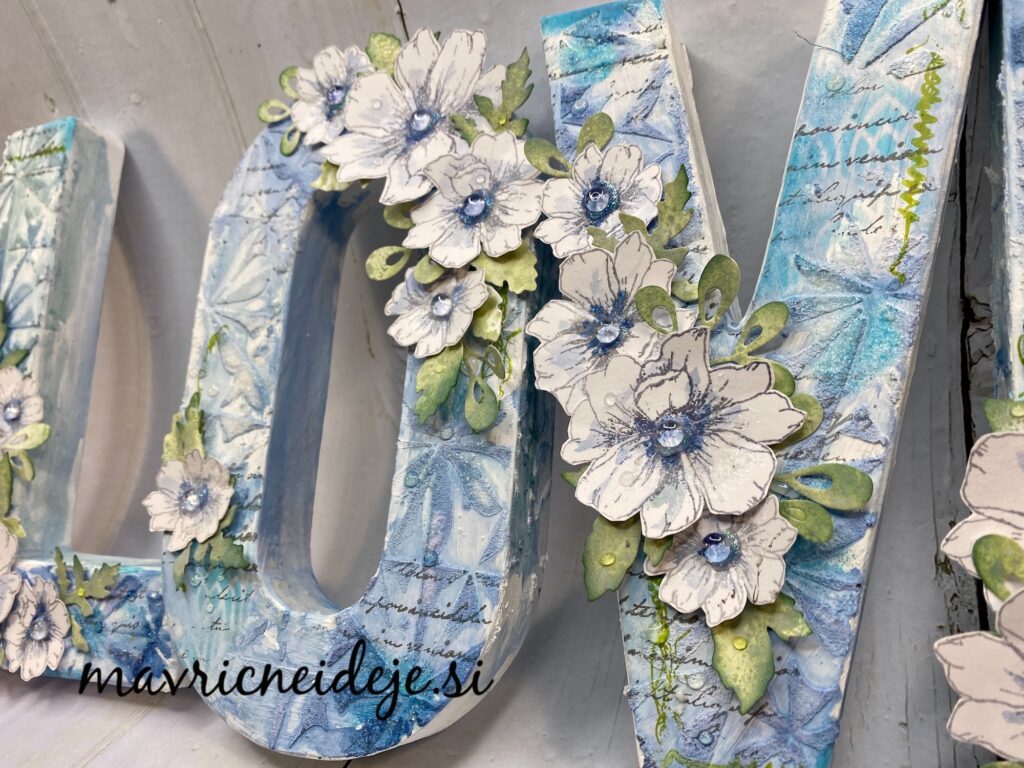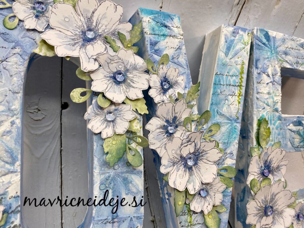 Rožice sem na črke nalepila z vročo pištolo in jim v sredino dodala Nuvo tekoče perle ter prozorno kapljico.