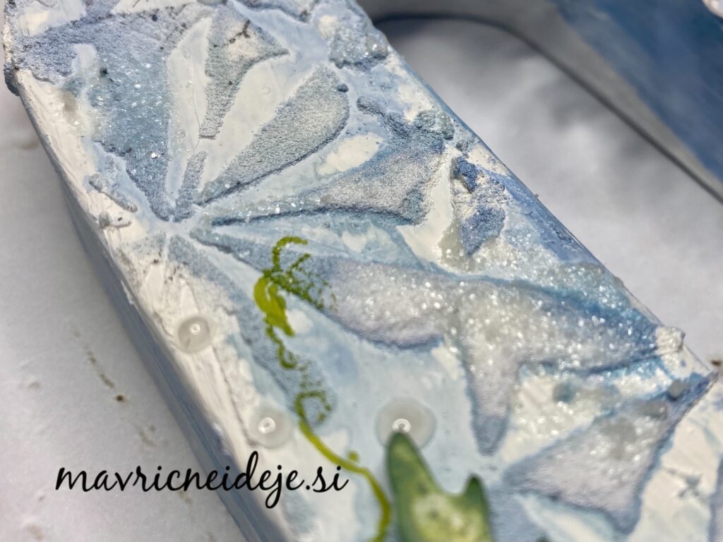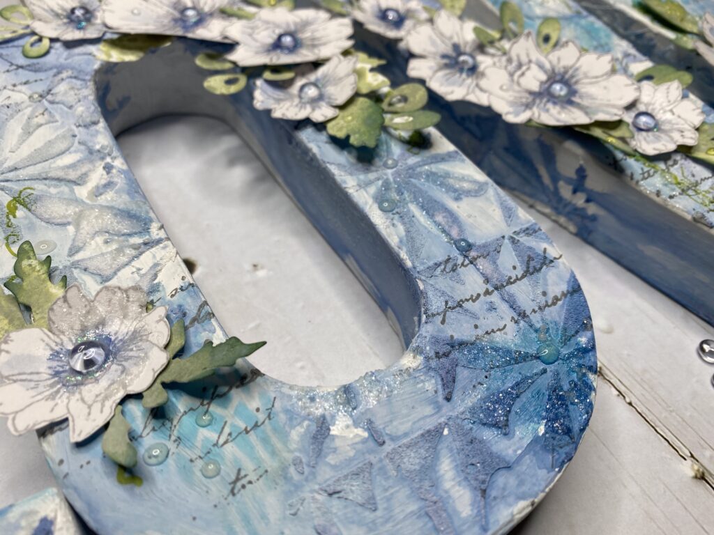 Na suho teksturno pasto sem s čopičem nanašala oba odtenka modre. Ranger Distress Grit paste ima to lastnost, da se Distress inki zelo dobro primejo nanjo, kar ustvarja zelo zanimive učinke. Med sušenjem barvnega nanosa sem si v Ranger prozorno teksturno pasto zamešala Ranger prozorne bleščice in jih z čopičem naključno nanesla na vso površino črk.