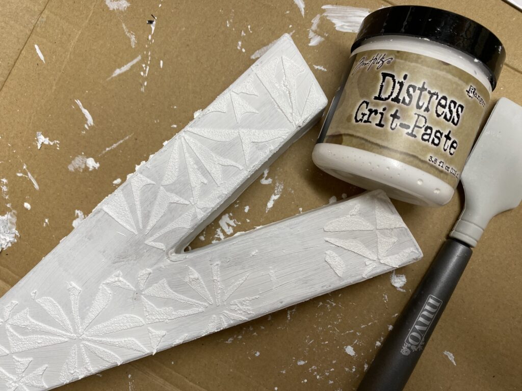 Črke sem dvakrat premazala z belim gesso premazom in nato preko stencil šablone mestoma teksturno pasto (Distress Grit Paste).