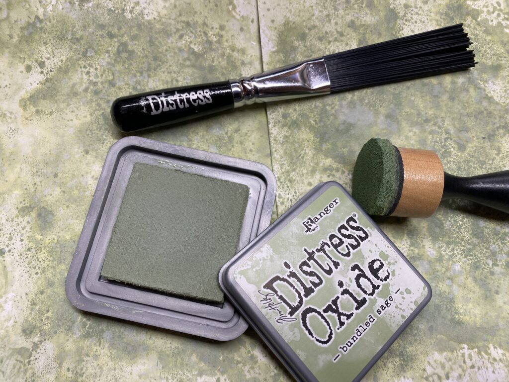 Med Distress Oxide inki sem našla ustrezne (distress Okxide broken china, faded jeans in bundled sage) barve in si za izdelavo zelenja pobarvala akvarelni papir (Florence).