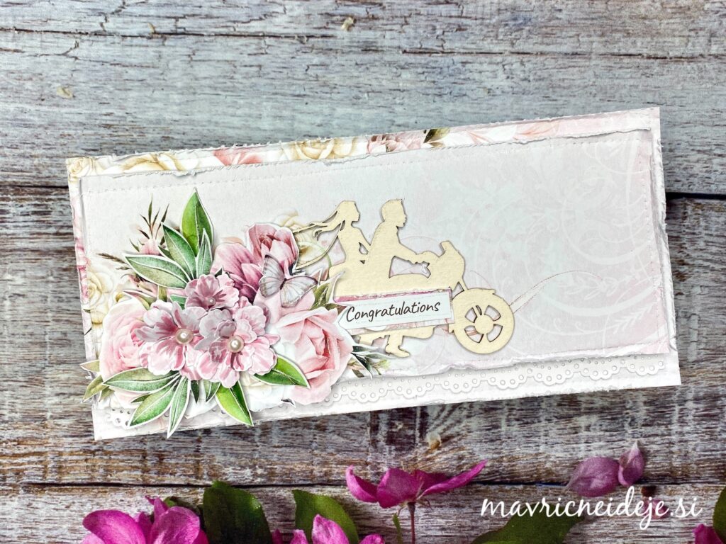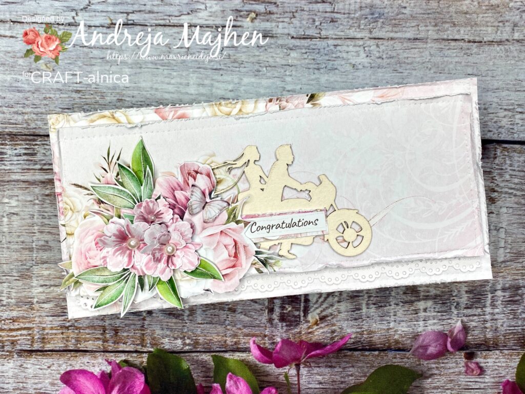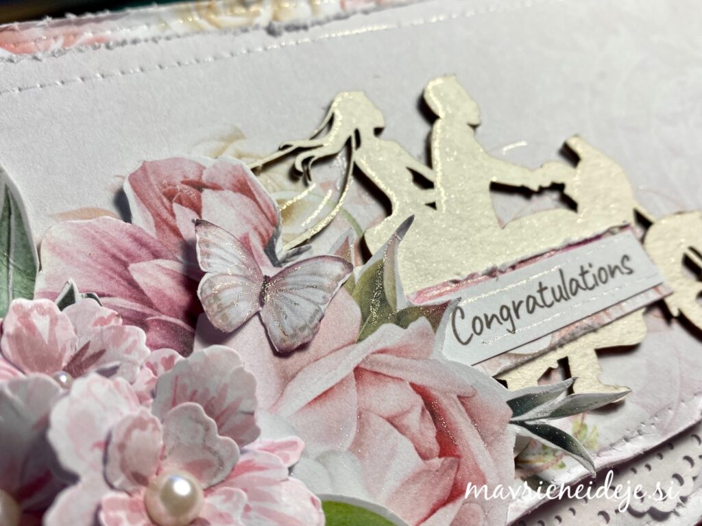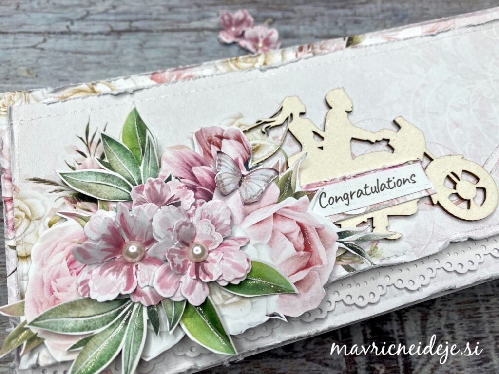 Uporabila sem krasen papir LemonCraft iz serije Elegance, izrez para na motorju Laserowe Love in rožice, ki sem jih izdelala s Heartfelt štampiljko in rezalno šablono. Dodala sem še pairnato čipko, ki sem jo izdelala s štanco-luknjačem. Rožice sem odtisnila na Color Copy papir in jih pobarvala s Copic markerji.