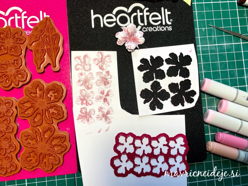 Iz zelene papirja sem z različnimi šablonami izrezala listke. Rožice sem z Archival ink shadow grey in watering can odtisnila na bel akvarelni papir in rahlo pobarvala predvsem sredino.