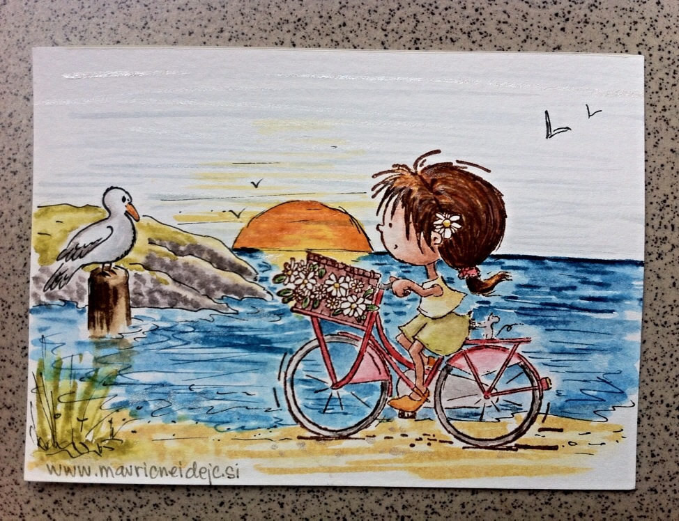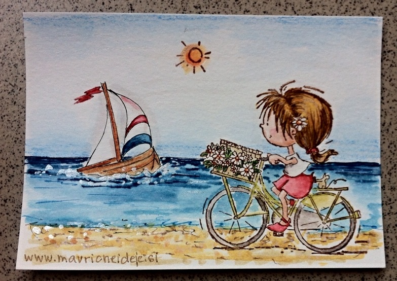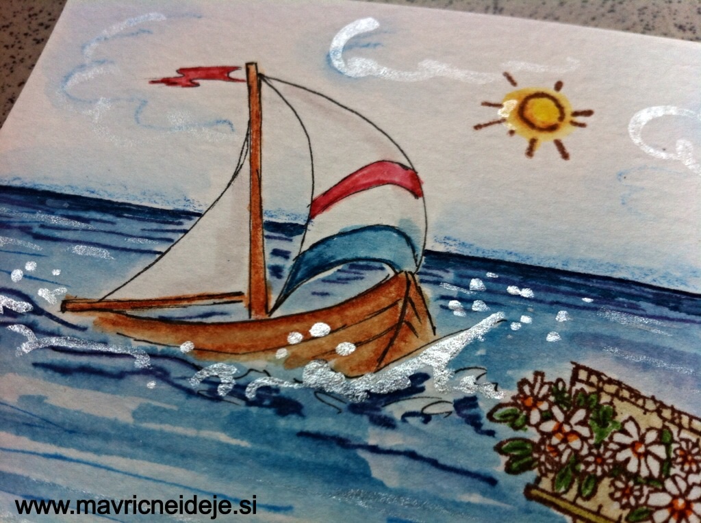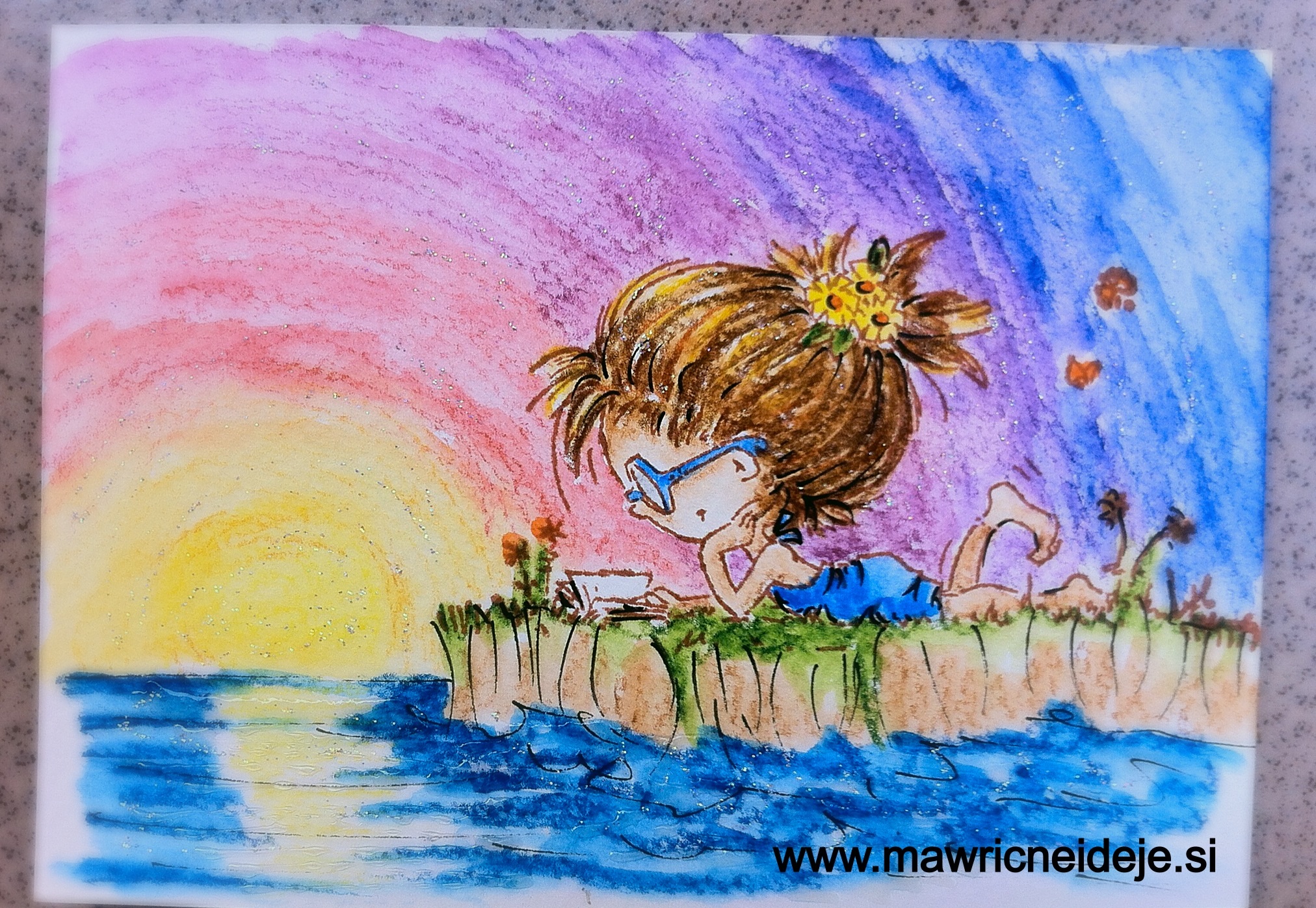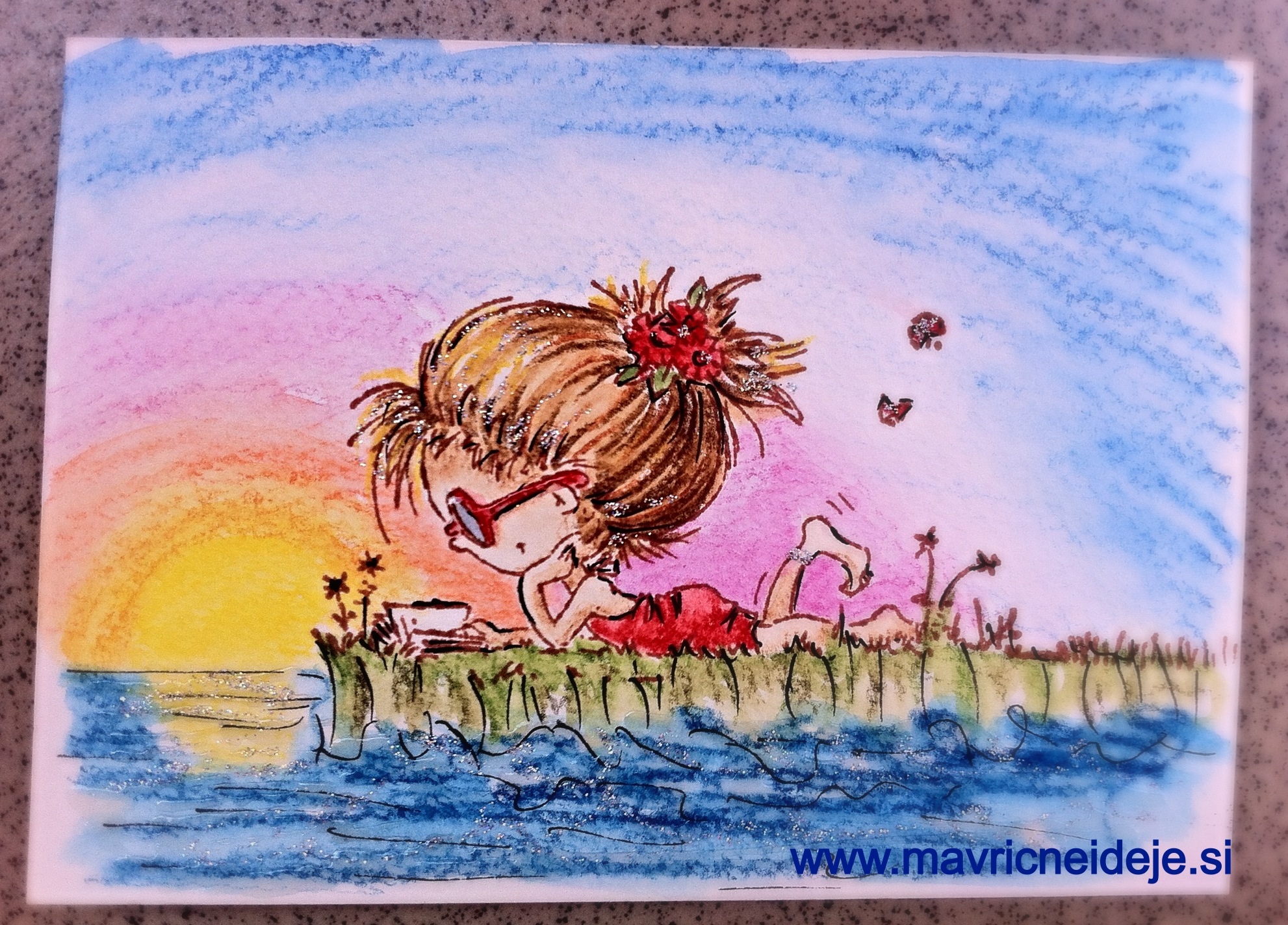 Tema 188. izziva Craftalnice je morje z ribicami, brez delfinov, kitov….ni kaj, kar zahteven izziv, ker so moji izdelki na temo morja polni raznovrstnih bitij. Pa sem vseeno našla razglednico, ki jo je hčerka prostoročno narisala lansko poletje. Barvala je z Derwent inktense barvicami.