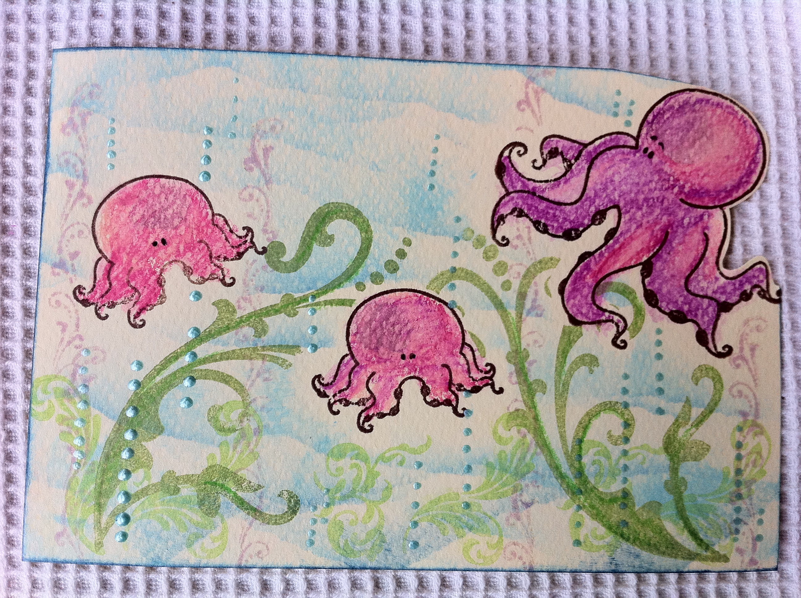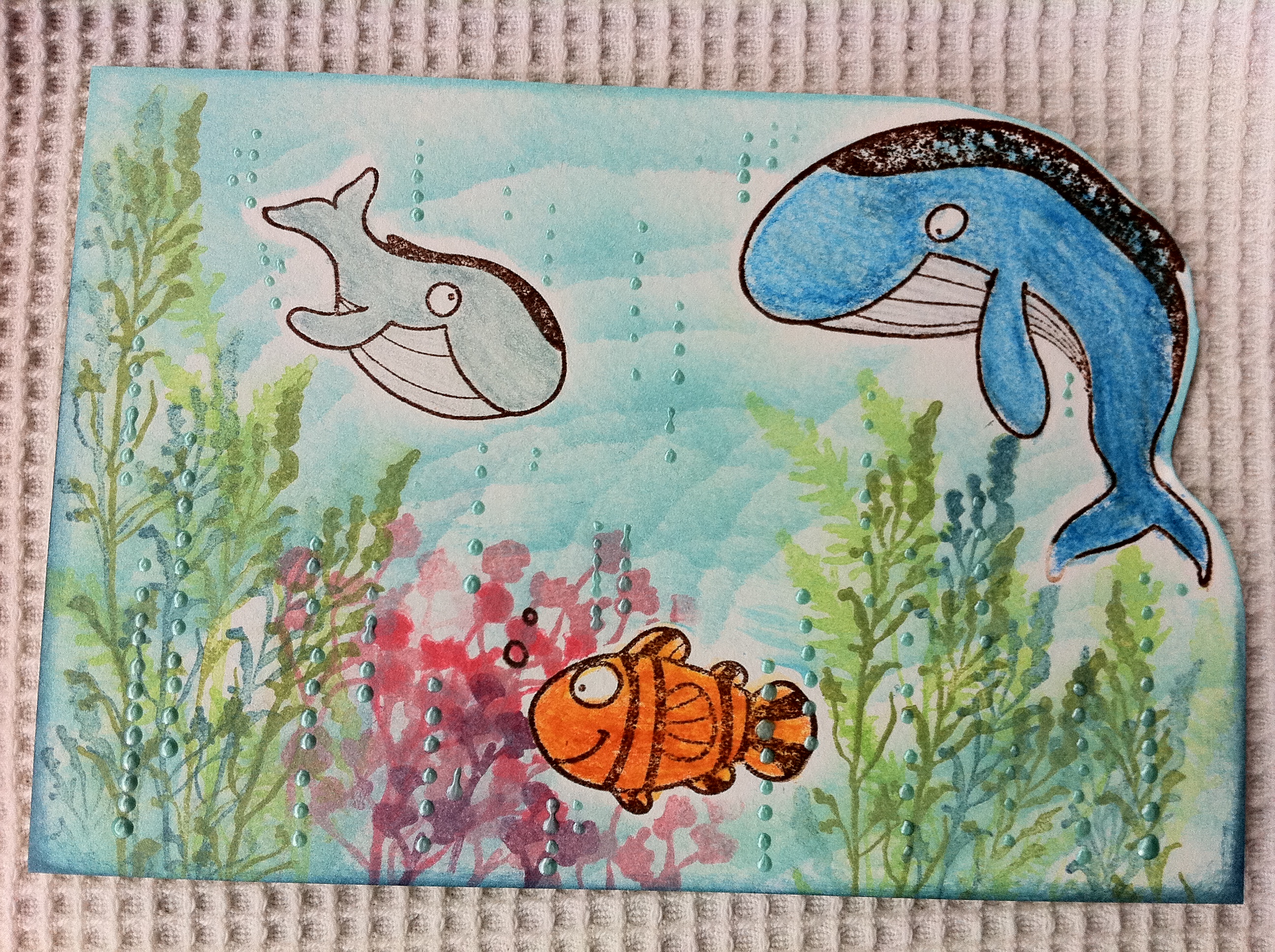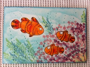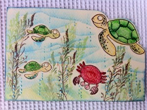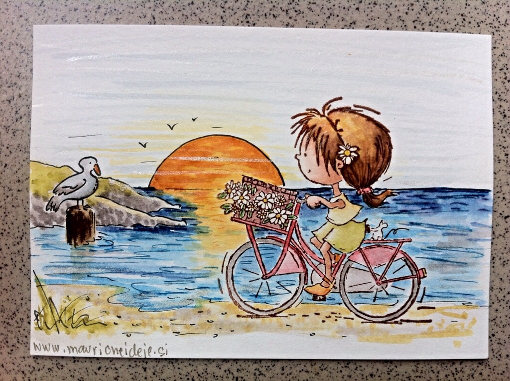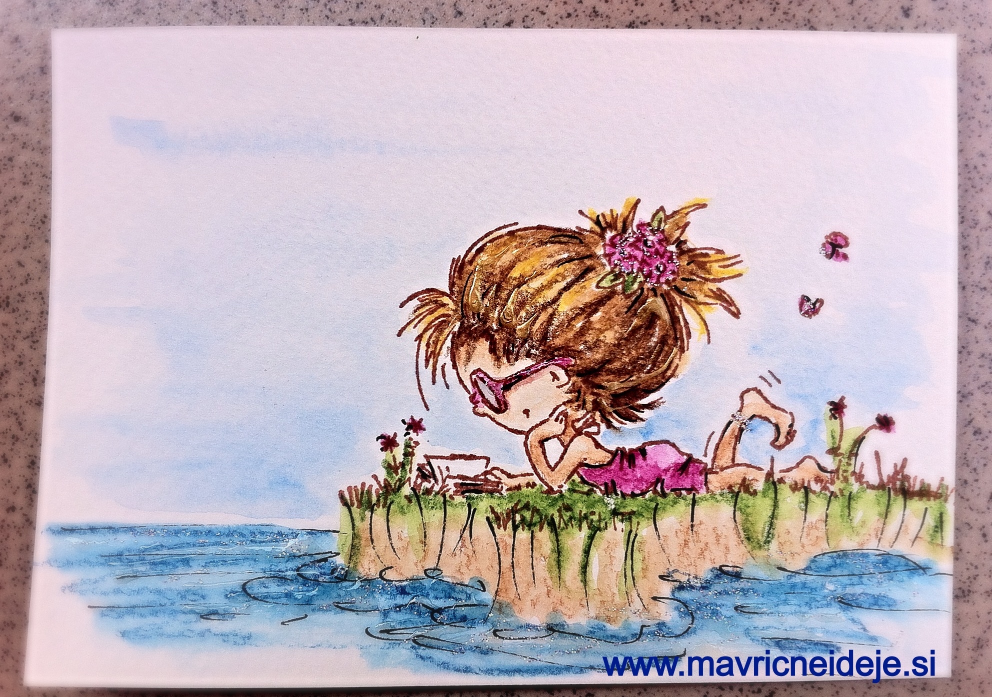 Tema 188. izziva Craftalnice je morje z ribicami, brez delfinov, kitov….ni kaj, kar zahteven izziv, ker so moji izdelki na temo morja polni raznovrstnih bitij. Pa sem vseeno našla razglednico, ki jo je hčerka prostoročno narisala lansko poletje. Barvala je z Derwent inktense barvicami.