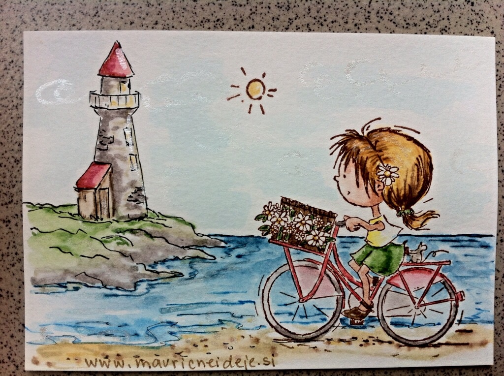 Uporabila sem akvarelni papir, Distress markerje, vodoodporno blazinico za odtis deklice na kolesu, vodoodporni marker za risanje ozadja, perfect pearls prah za malce sijaja.